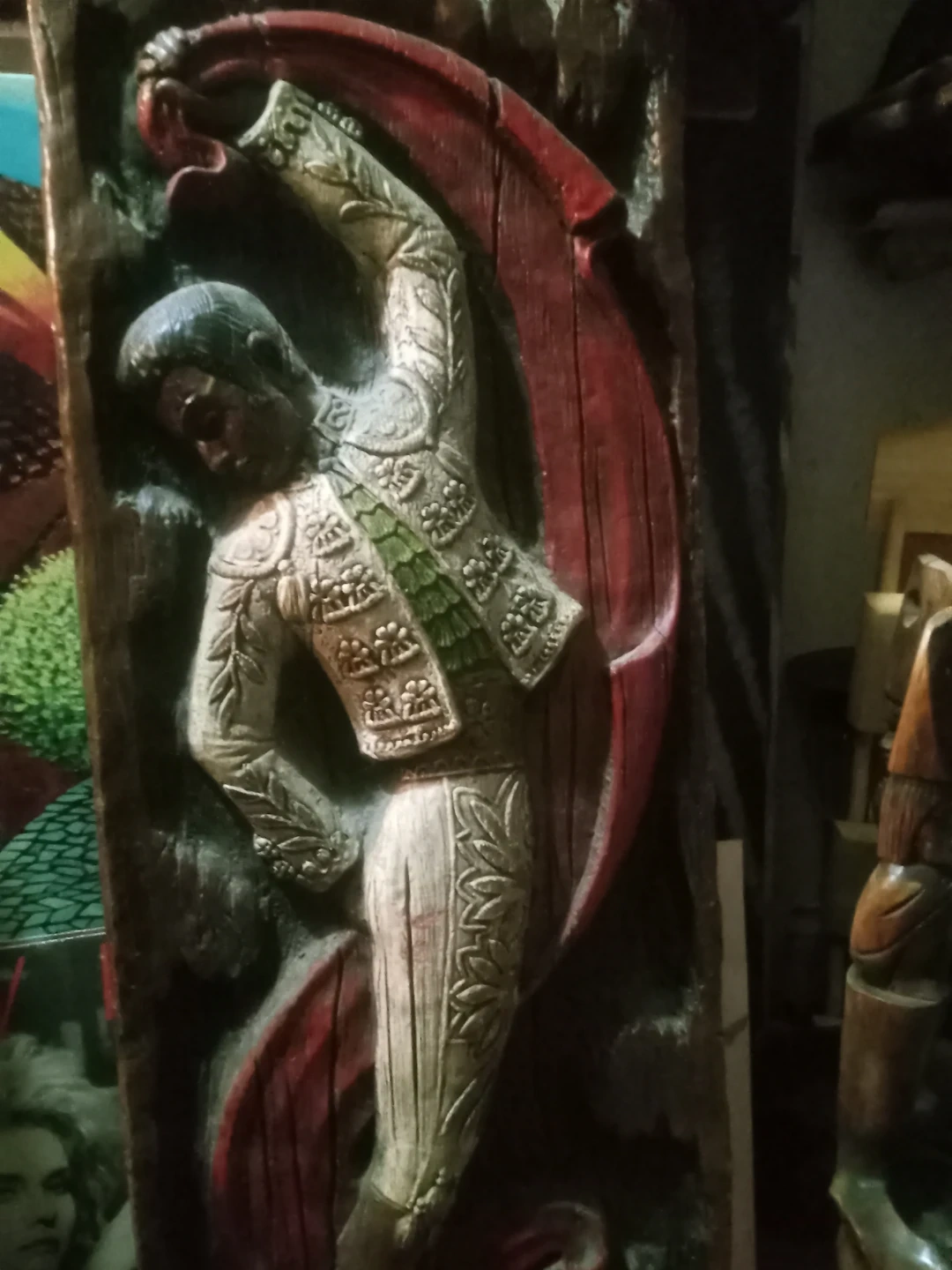 This is a hand-carved wooden wall art piece depicting a matador. The detailed carving shows the matador in traditional attire, complete with a red cape. It's a unique decorative item.