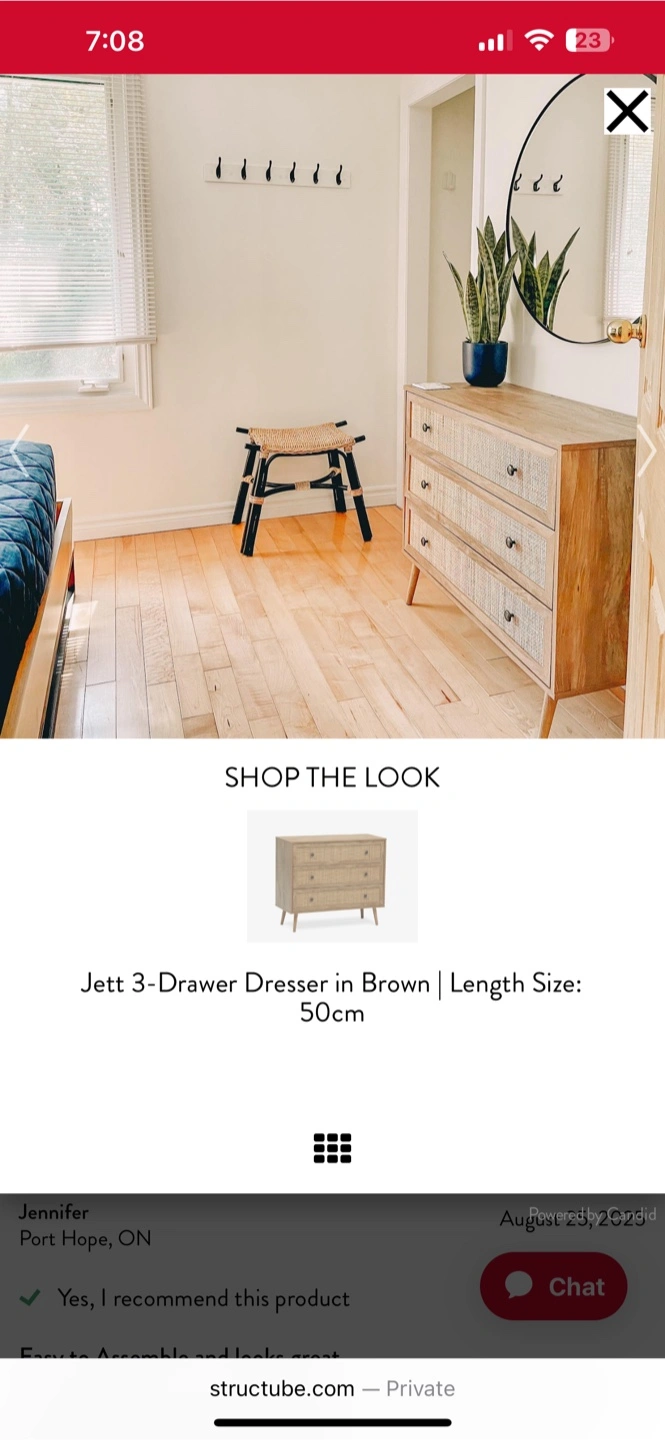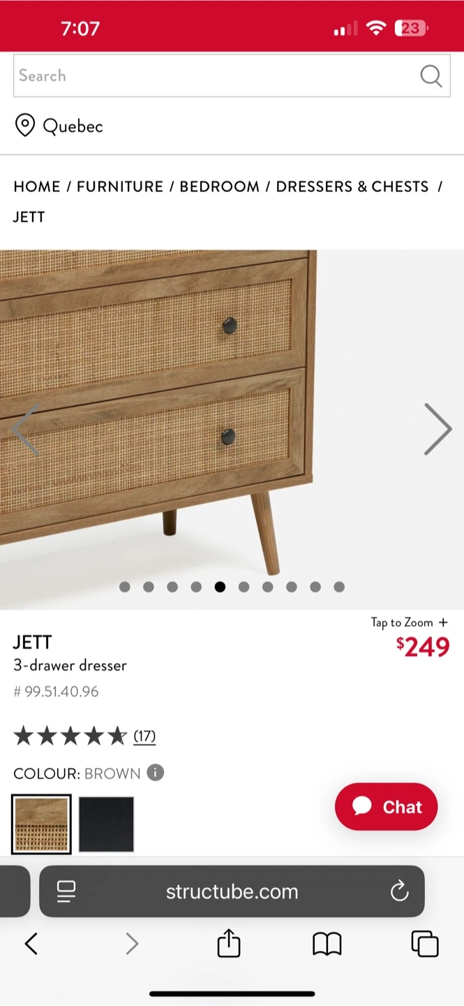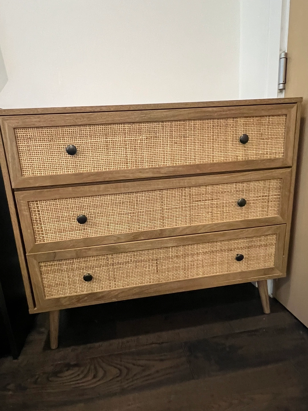 Looking to sell this Structube Jett 3-drawer dresser in brown! It features a stylish design with rattan drawer fronts. This dresser originally retailed for $249 and would be a great addition to any bedroom.