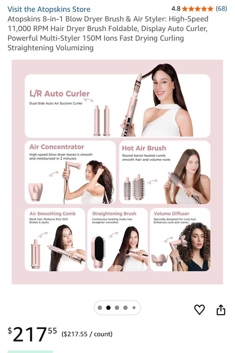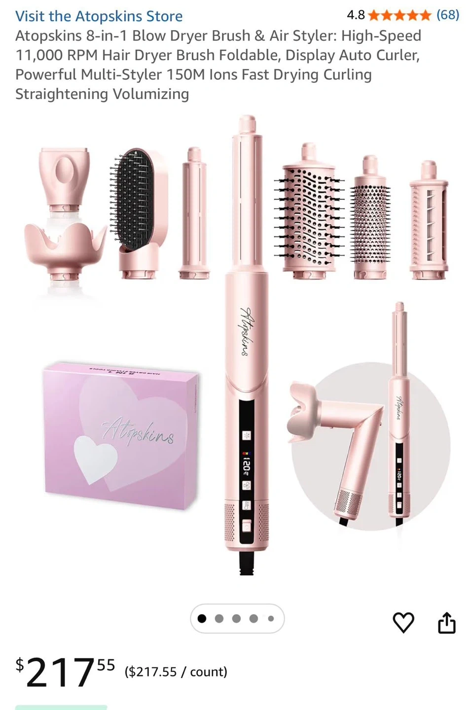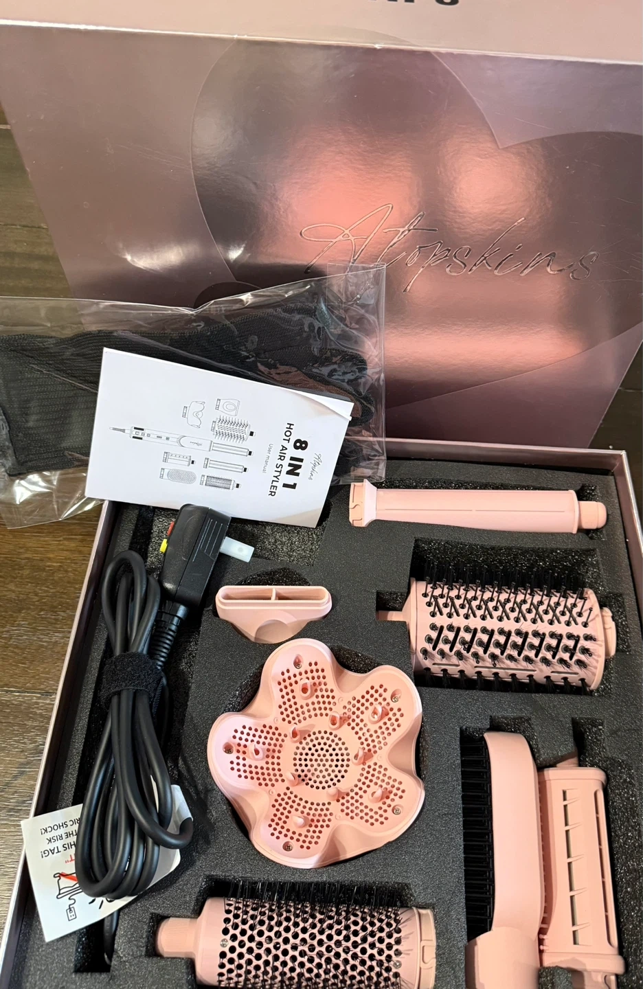 This is an Atopskins 8-in-1 hair dryer brush and air styler. It includes multiple attachments for curling, straightening, and volumizing hair. The package contains the main unit, various brush heads, and accessories.
