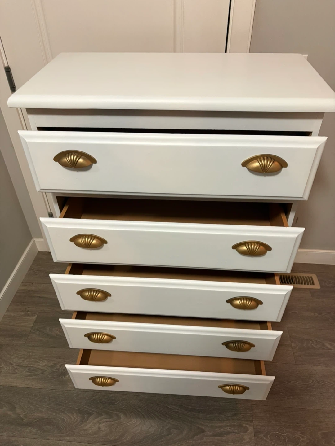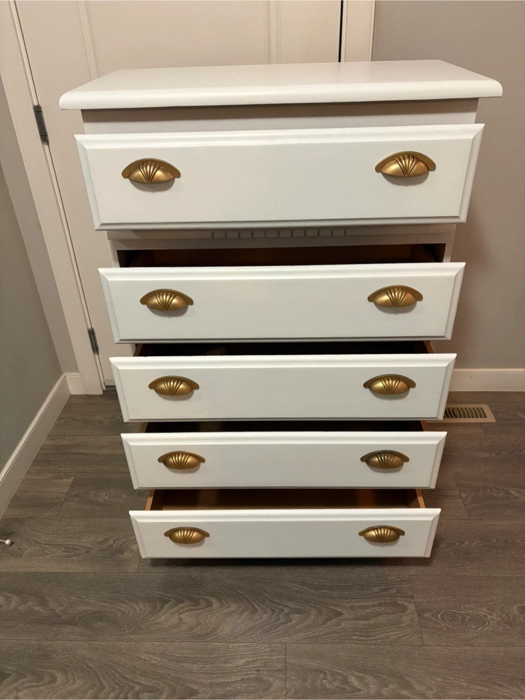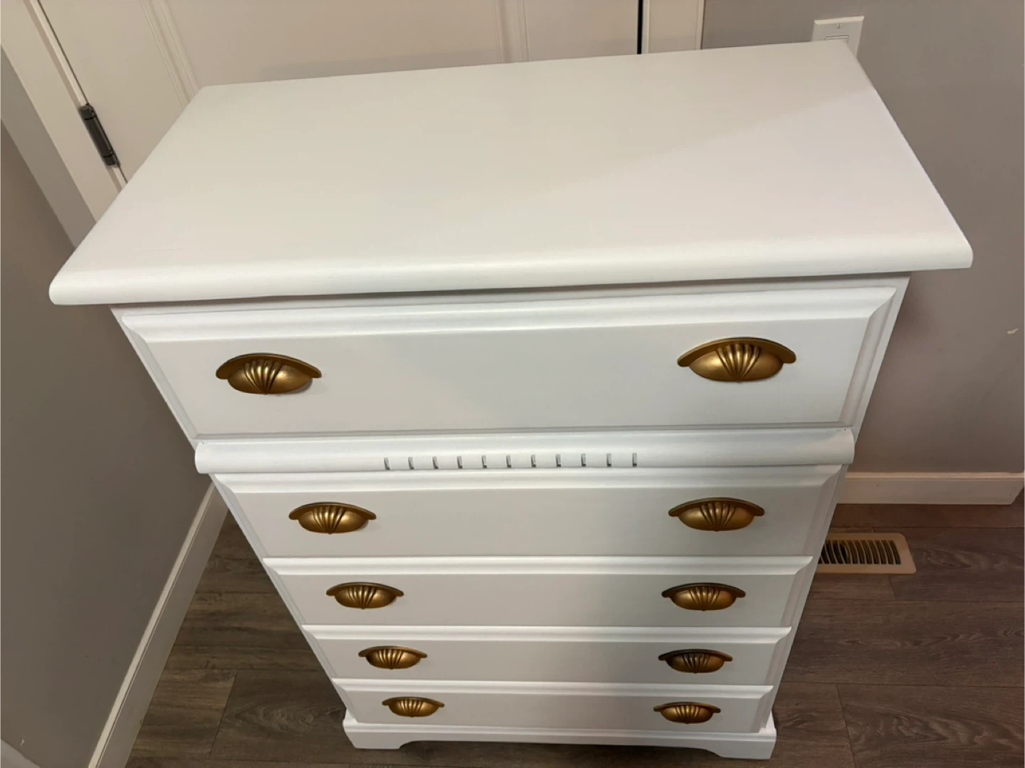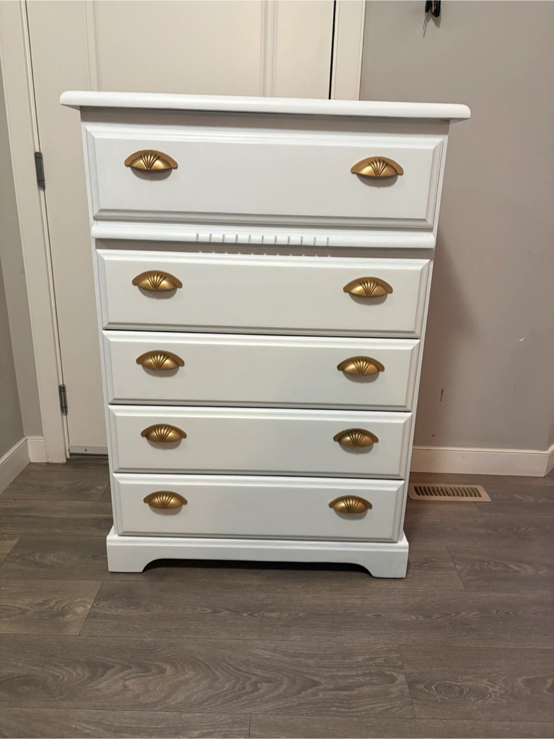 This is a refinished white chest of drawers with five spacious drawers and gold hardware. This piece offers ample storage while adding a touch of elegance to any room. Drawers are on rolls and slide smooth.