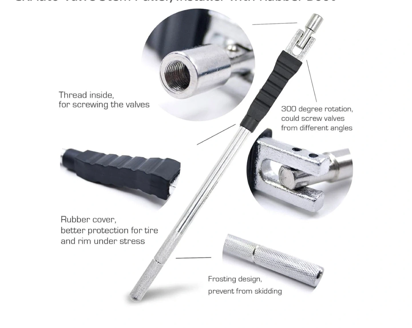 248Selling a CKAuto valve stem puller and installer complete with a rubber boot! The tool features a thread inside for screwing the valves, and the rubber cover offers better protection for the tire and rim under stress. It also has a 360-degree rotation, allowing you to screw valves from different angles. The frosting design helps prevent skidding. The box is included!