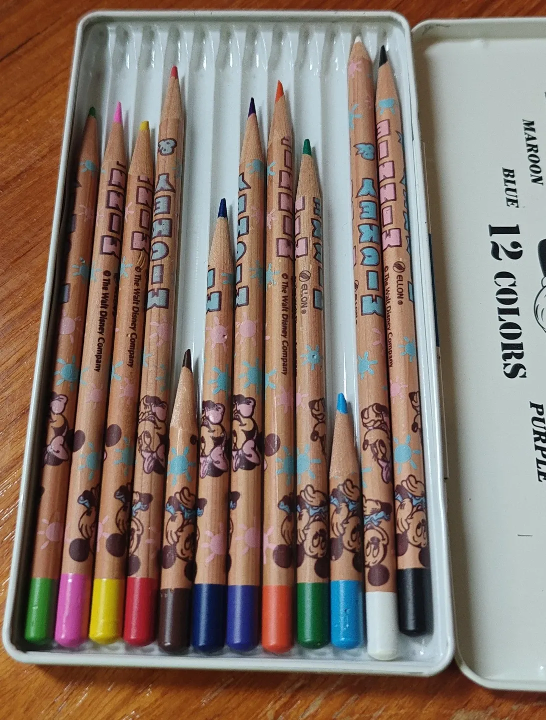 A set of 12 coloured pencils featuring Mickey Mouse and his friends. These pencils come in a tin case. Perfect for drawing and colouring! Made by ELLON.