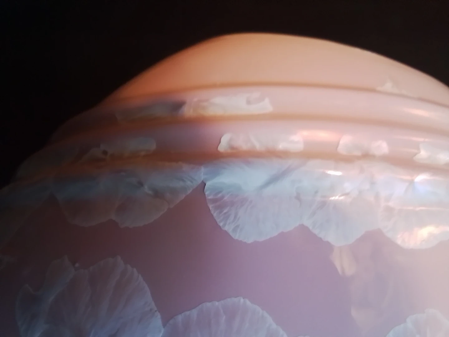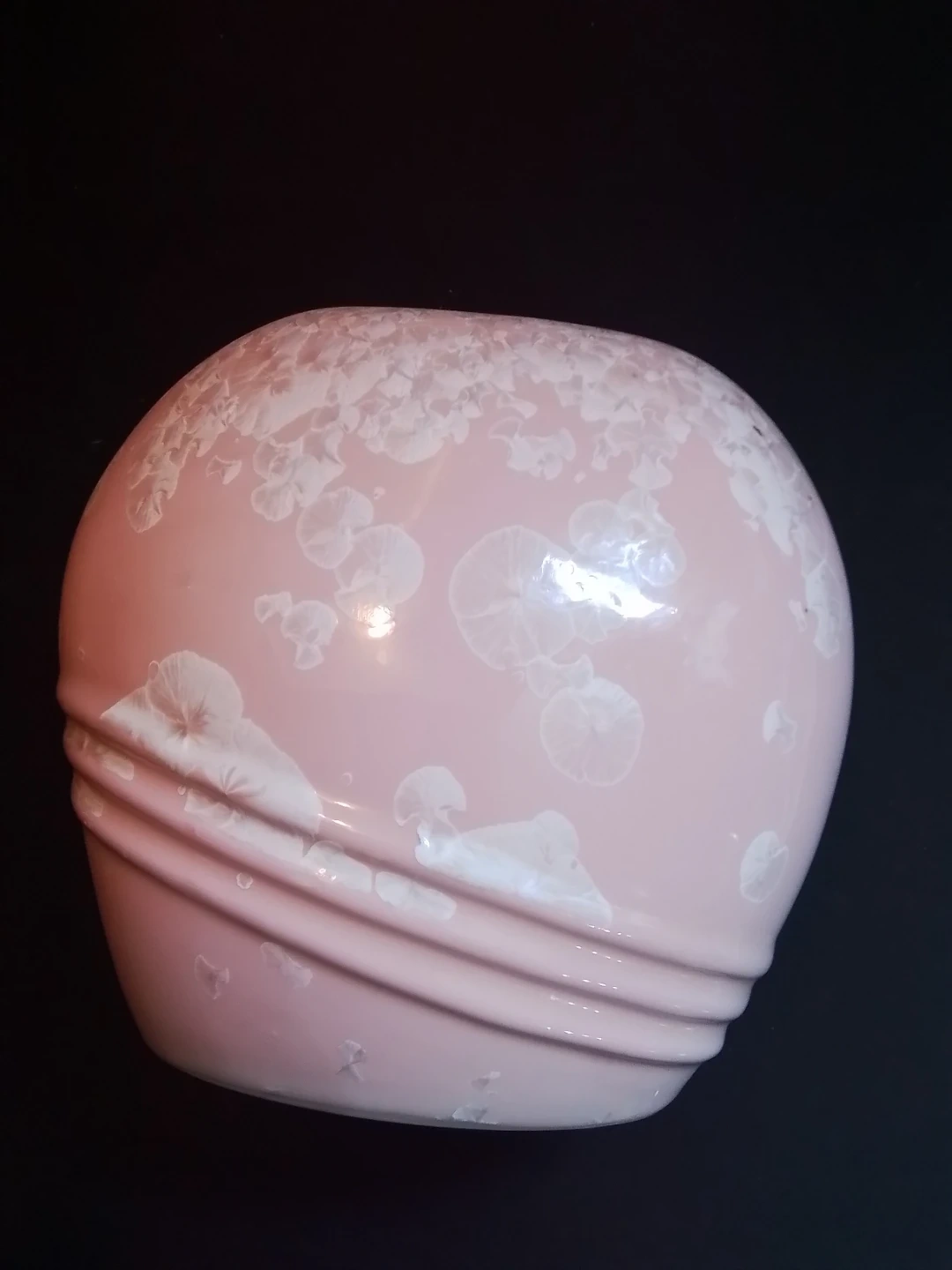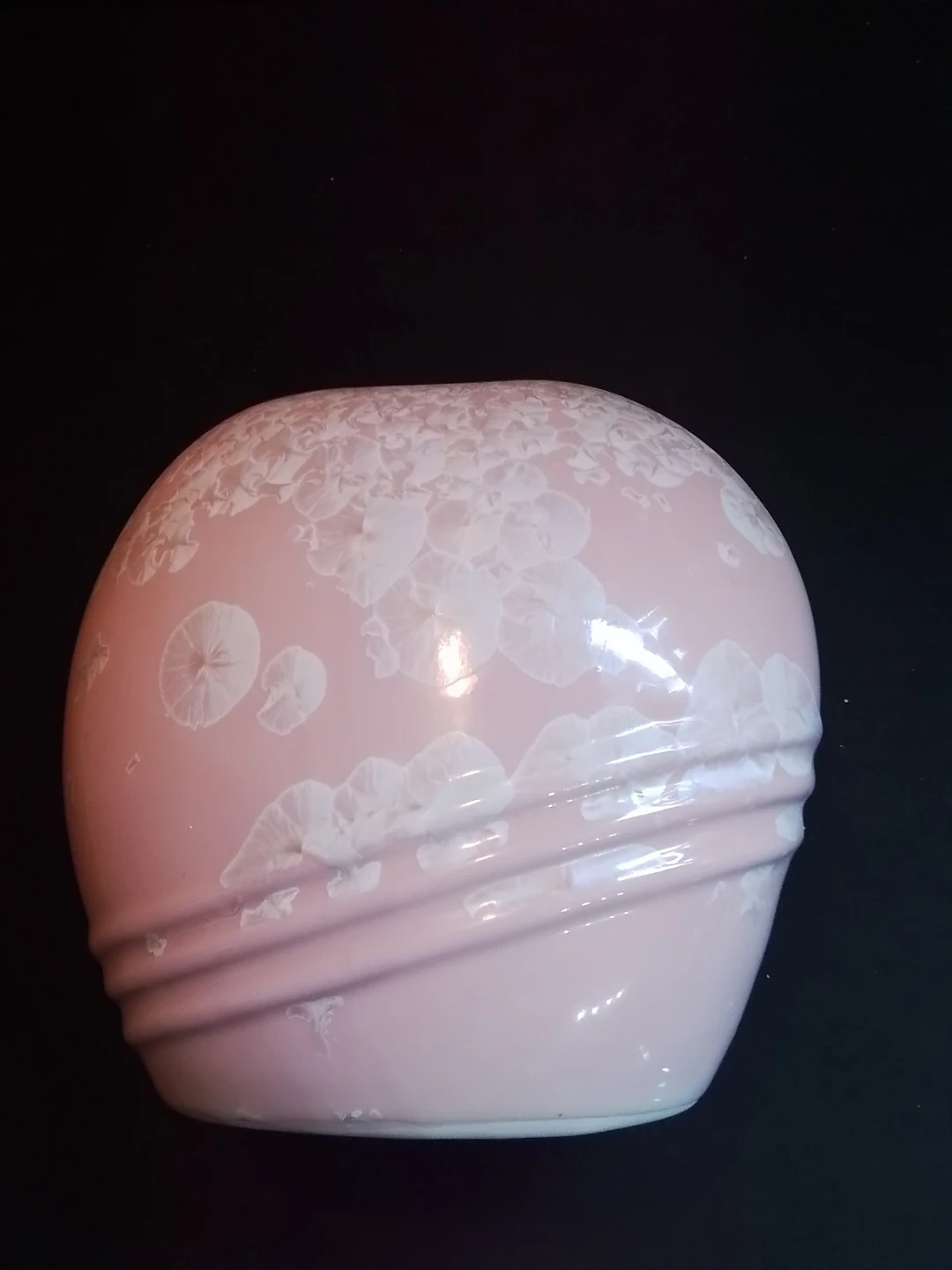 This is a used vintage Chinese pink crystalline glazed ceramic vase, standing at approximately 7.5 inches in diameter and 7 inches in height. The vase features a delicate pink hue complemented by unique crystalline patterns across its surface. It is signed on the bottom with a Chinese character mark, adding to its authenticity and collectibility.