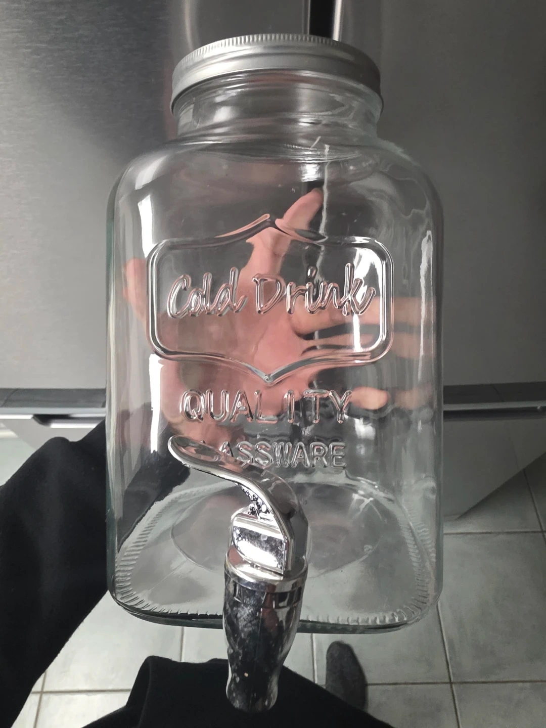 This glass drink dispenser has a large capacity for beverages. It features a metal spigot for easy pouring. Perfect for parties or gatherings!