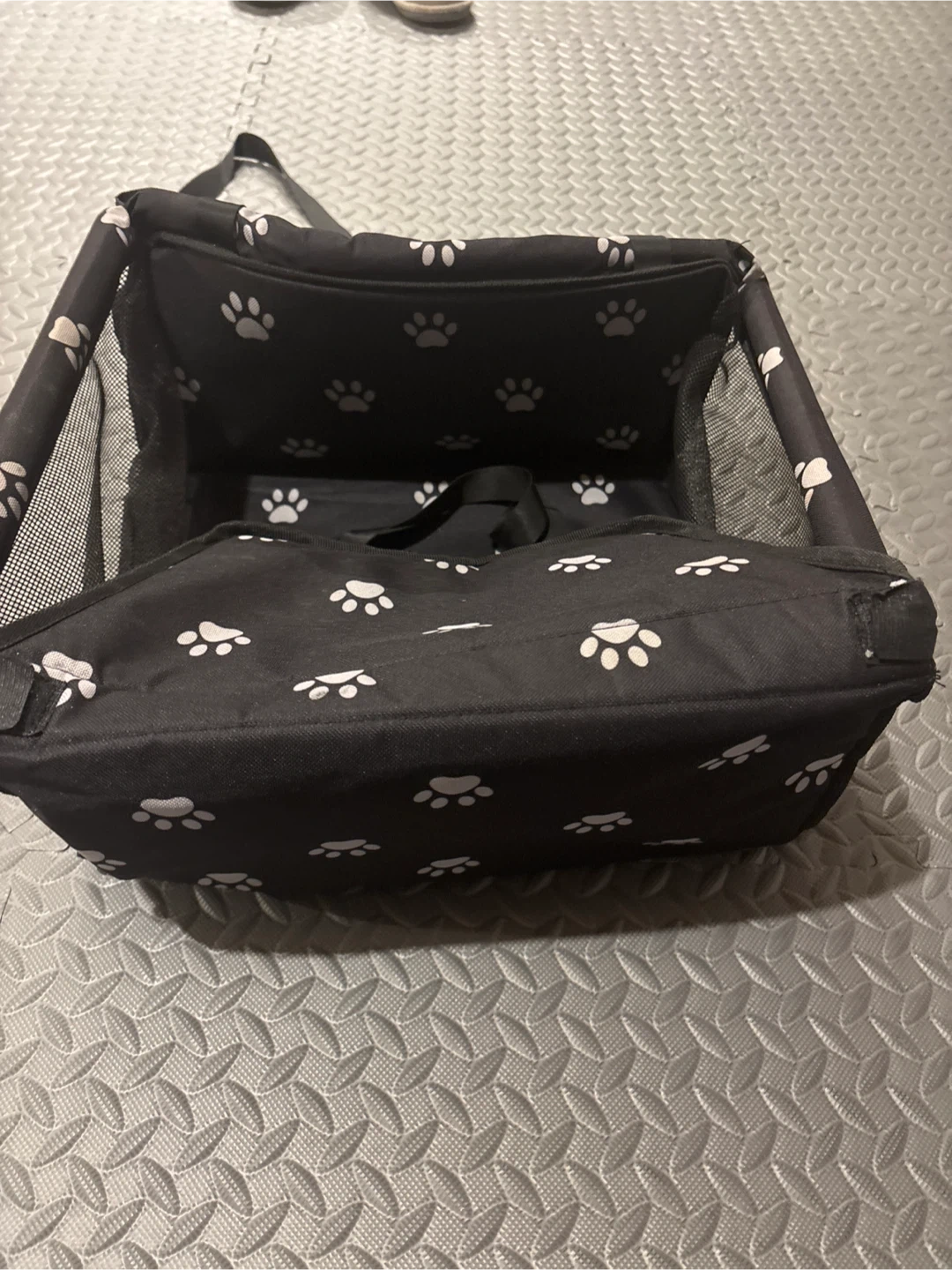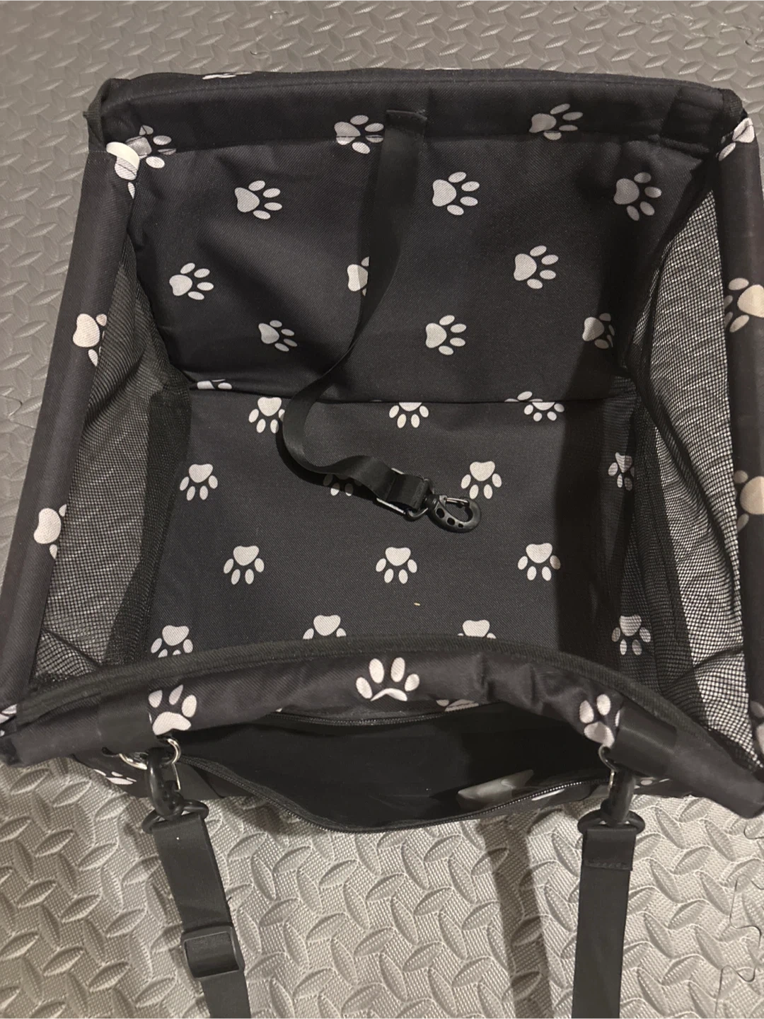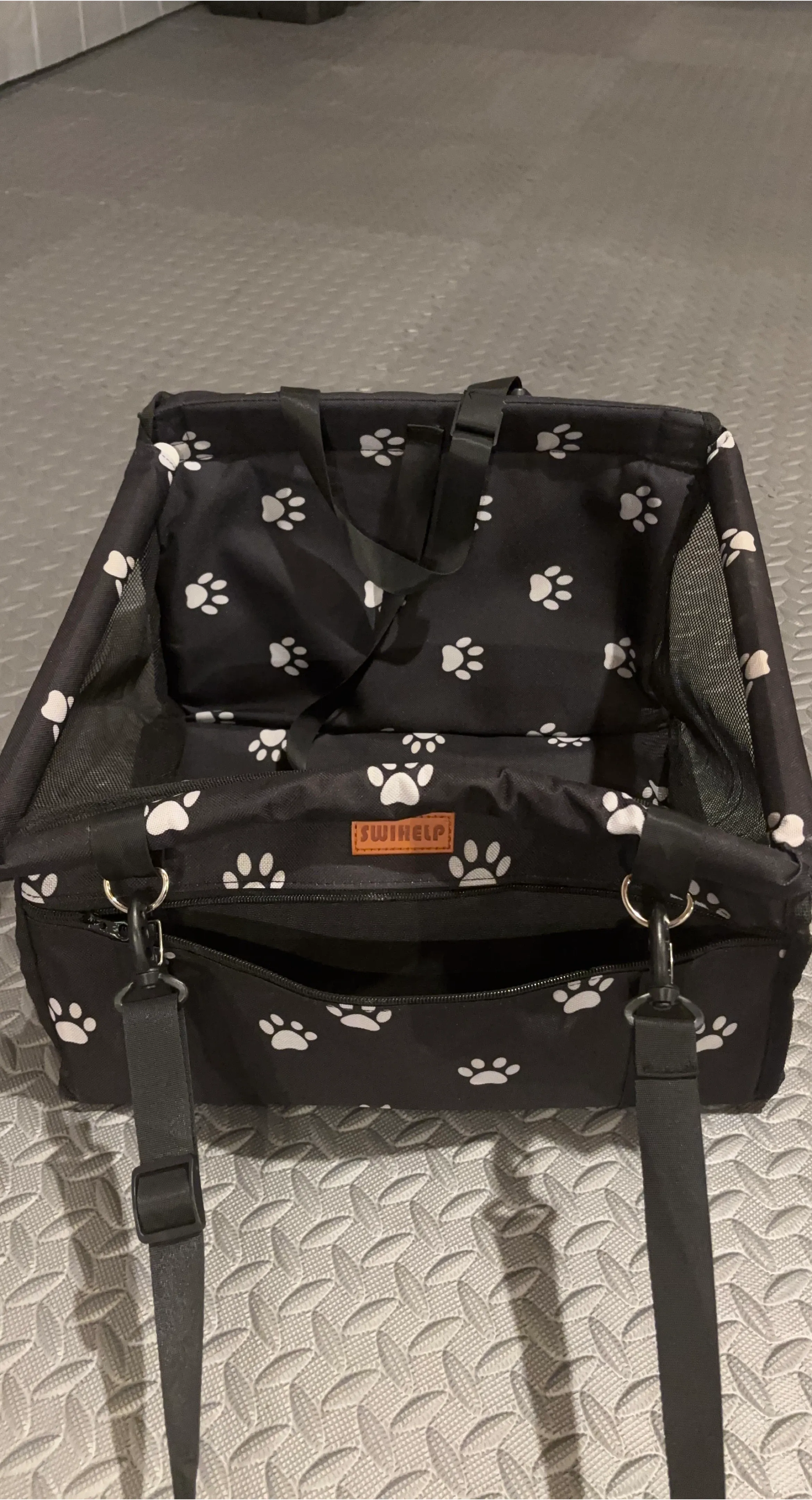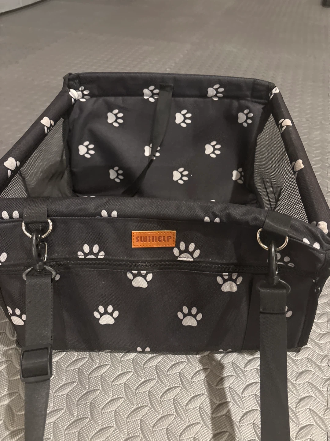 Never Used!!This is a SWINELP pet car seat booster. It features a black fabric with white paw prints. The sides are made of mesh for ventilation. There's a strap inside to secure your pet.