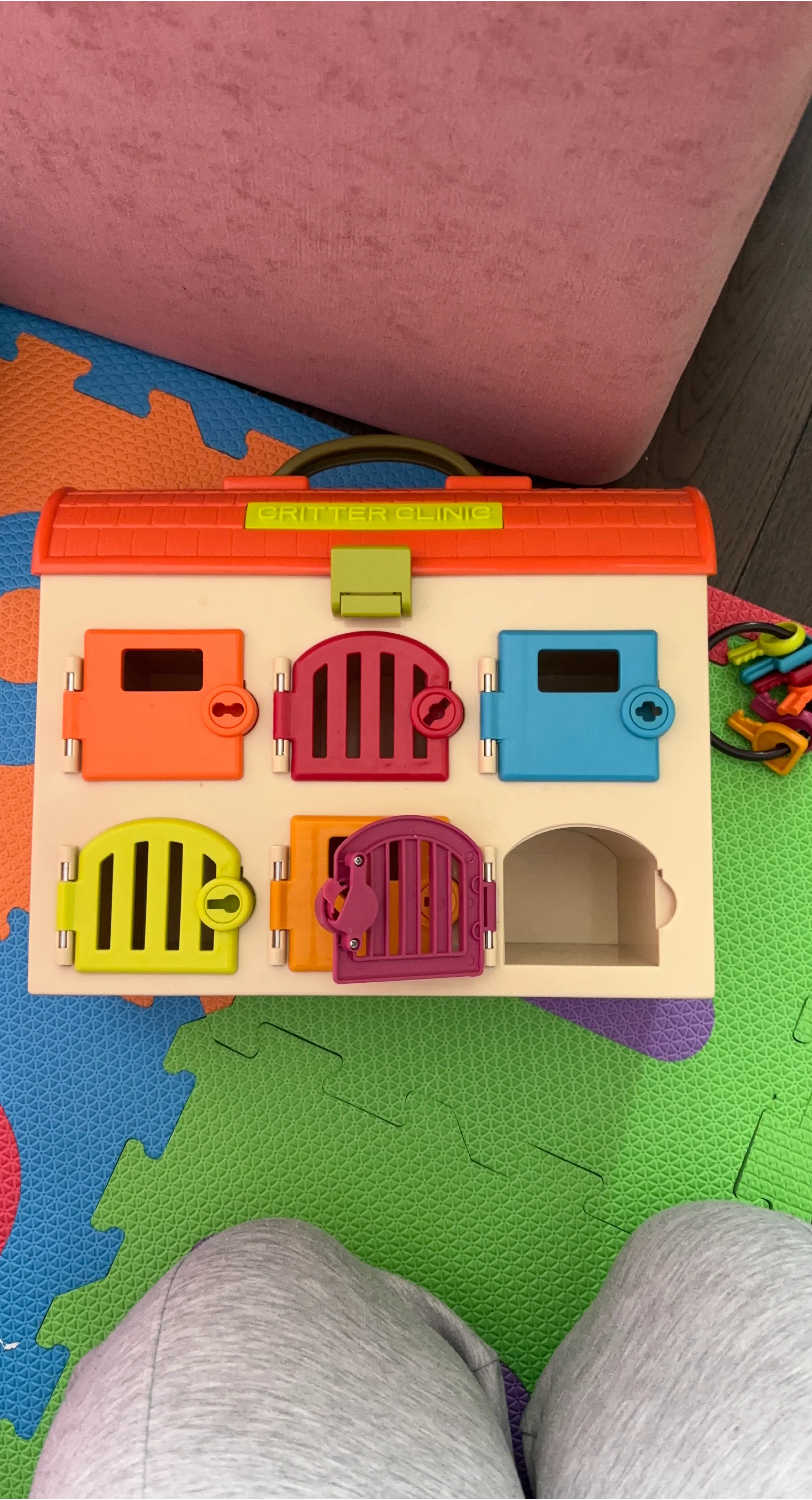 This is the Critter Clinic activity toy. It features multiple doors with different latches and locks. Includes a set of colourful keys.