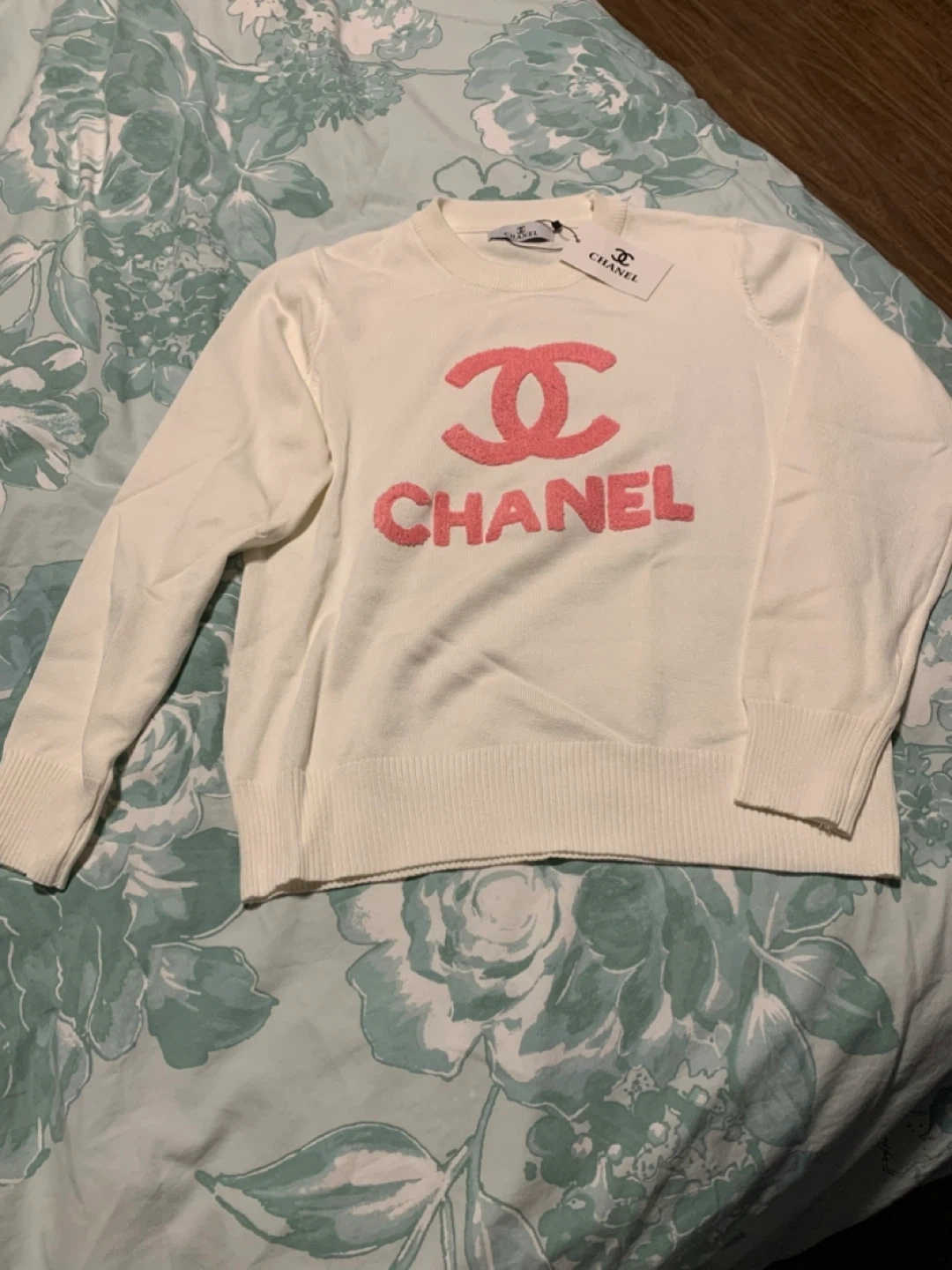 This is a Chanel long-sleeve crewneck sweater in white with a pink logo. It appears to be a size medium. Made from a comfortable knit material. One size but doesn’t fit xl