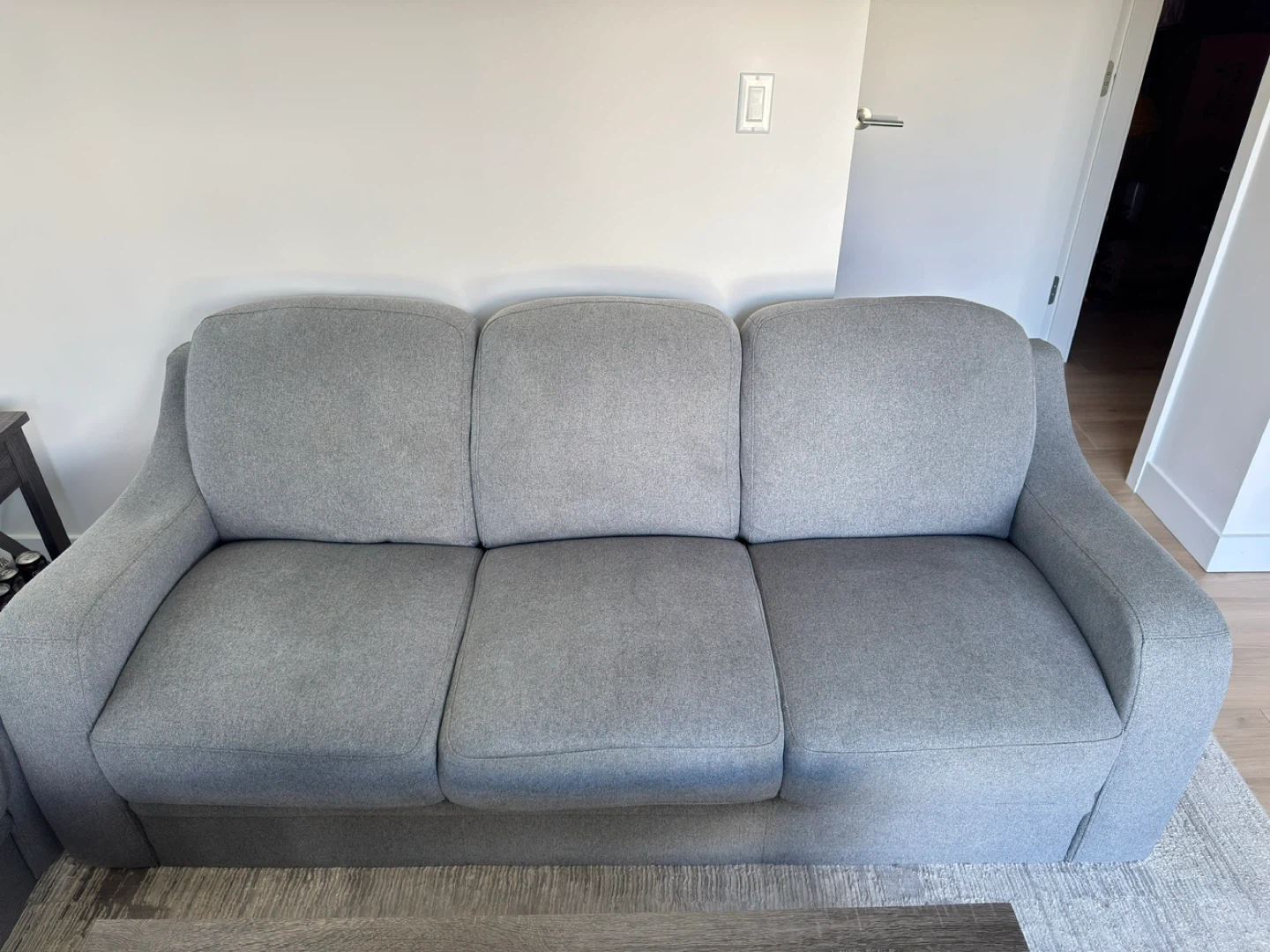 Comfortable two-seater loveseat and three-seater sofa in a soft grey fabric. Perfect for a living room or den! Both pieces have clean lines and a modern look.