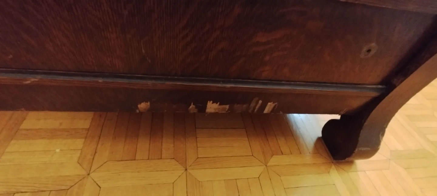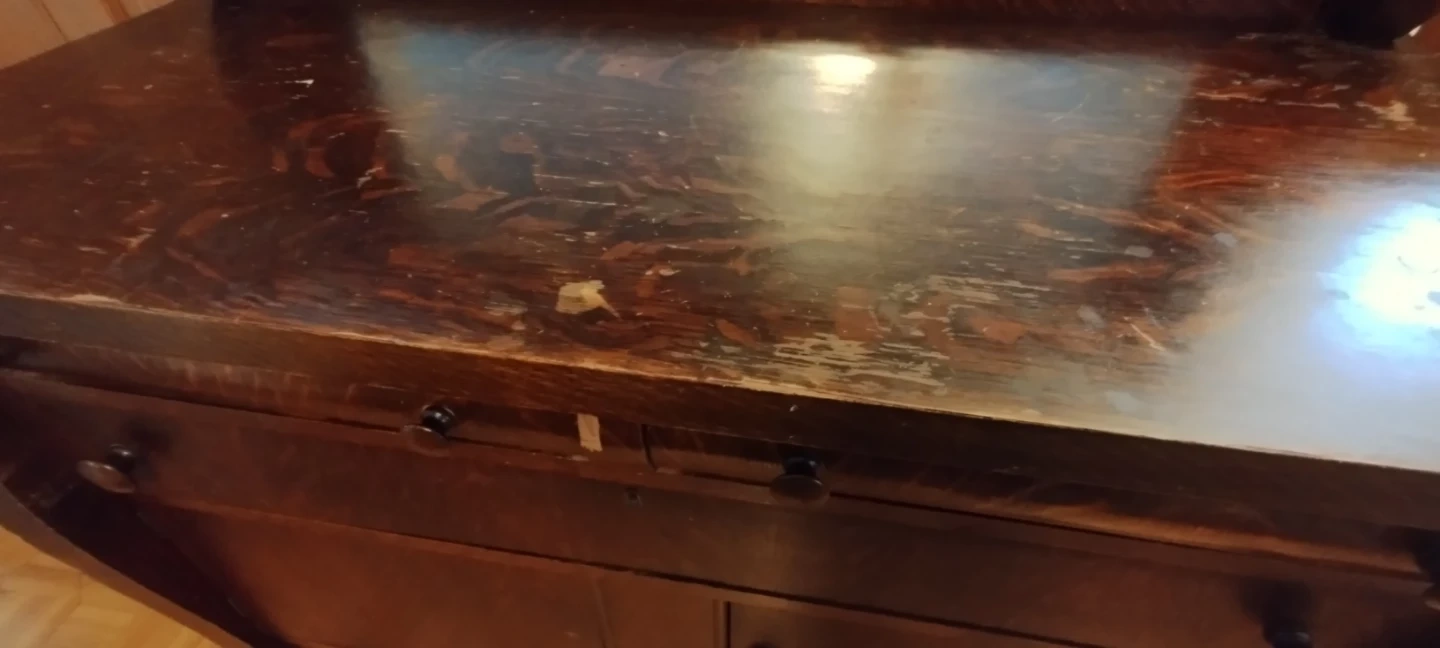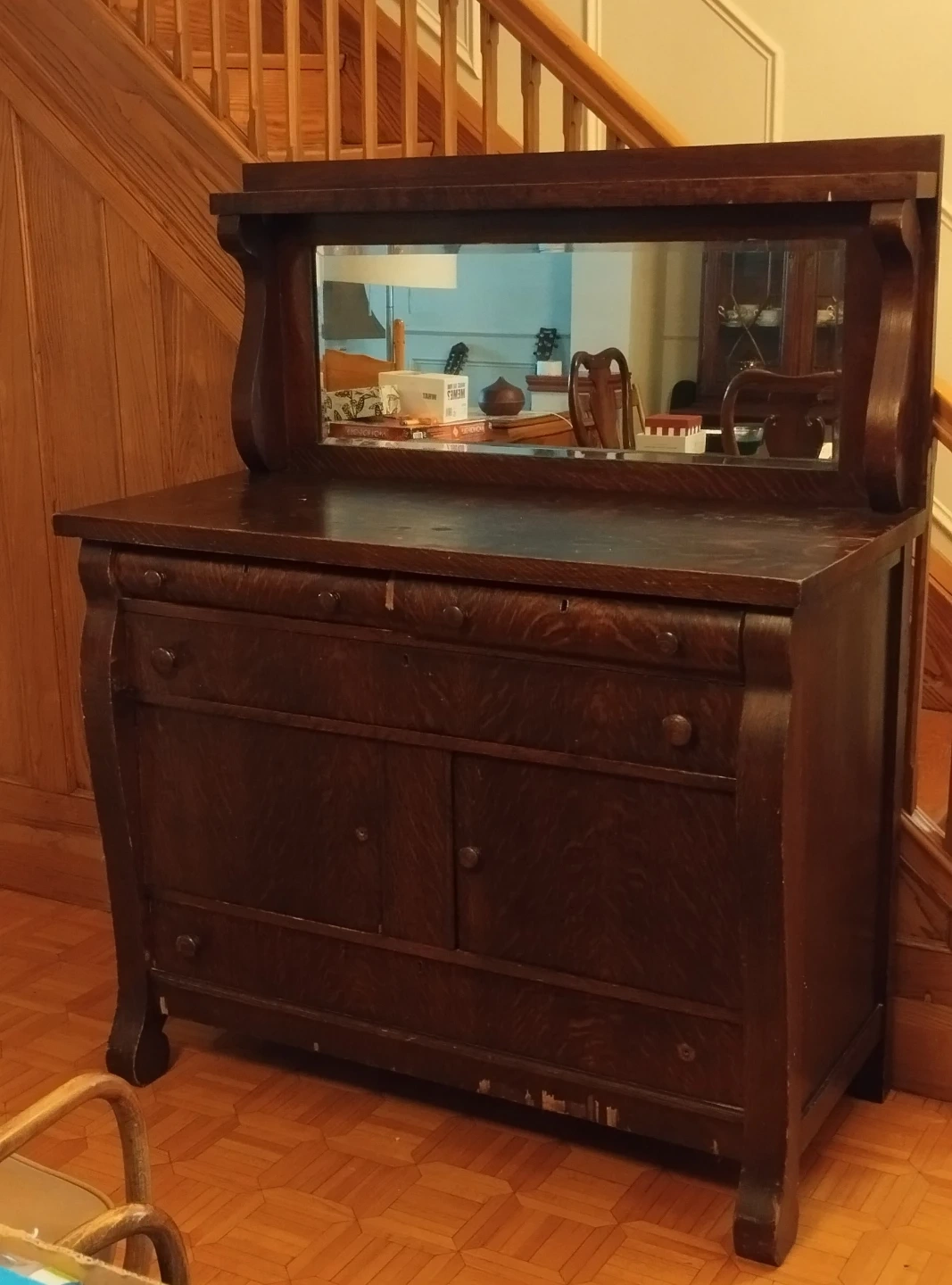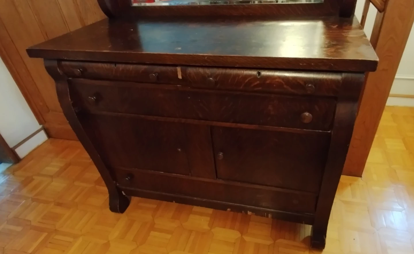 This antique dresser is made of dark wood and features a large mirror. It has multiple drawers and cabinets for storage. There's some wear and tear on the bottom edges and some drawer fronts, consistent with its age. Missing one knob. Also considered a side board . Needs restauration