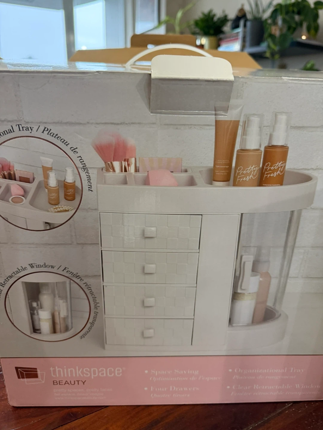 This Thinkspace Beauty organizer tray is designed for convenient storage and organization. It features four drawers and a clear retractable window. It's perfect for keeping your makeup and beauty products tidy.