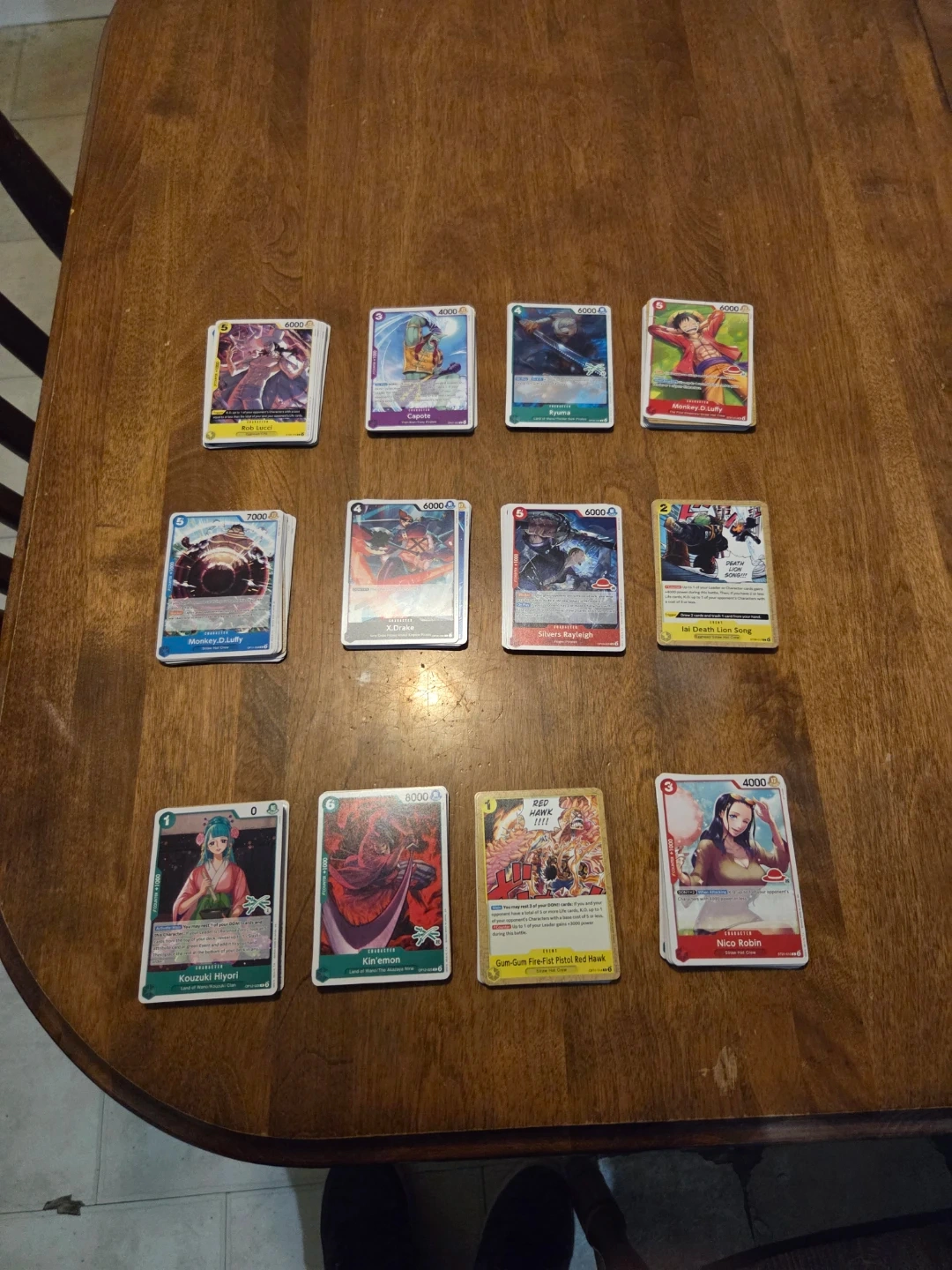 Collection of One Piece Card Game cards including Monkey D. Luffy, Nico Robin, and Kin'emon. Cards feature various characters and attack names. These are collectible trading cards for the One Piece game.