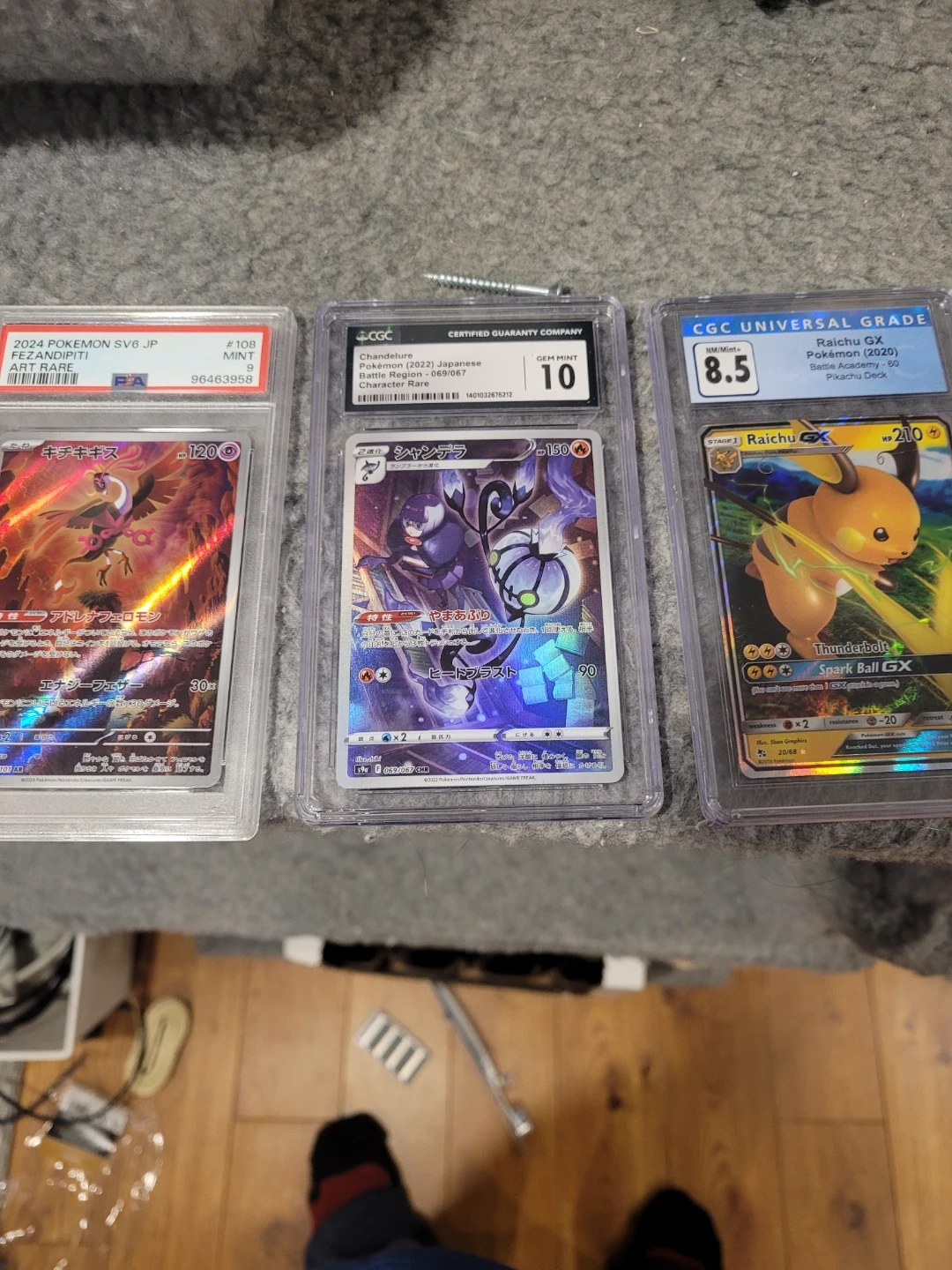 Three graded Pokemon trading cards are included: Fezandipiti (2024 SV6 JP, #108, Mint 9), Chandelure (2022 Japanese Battle Region, 069/067, Gem Mint 10), and Raichu GX (2020 Battle Academy, 20/68, NM/Mint+ 8.5). These are collectible items for Pokemon fans.