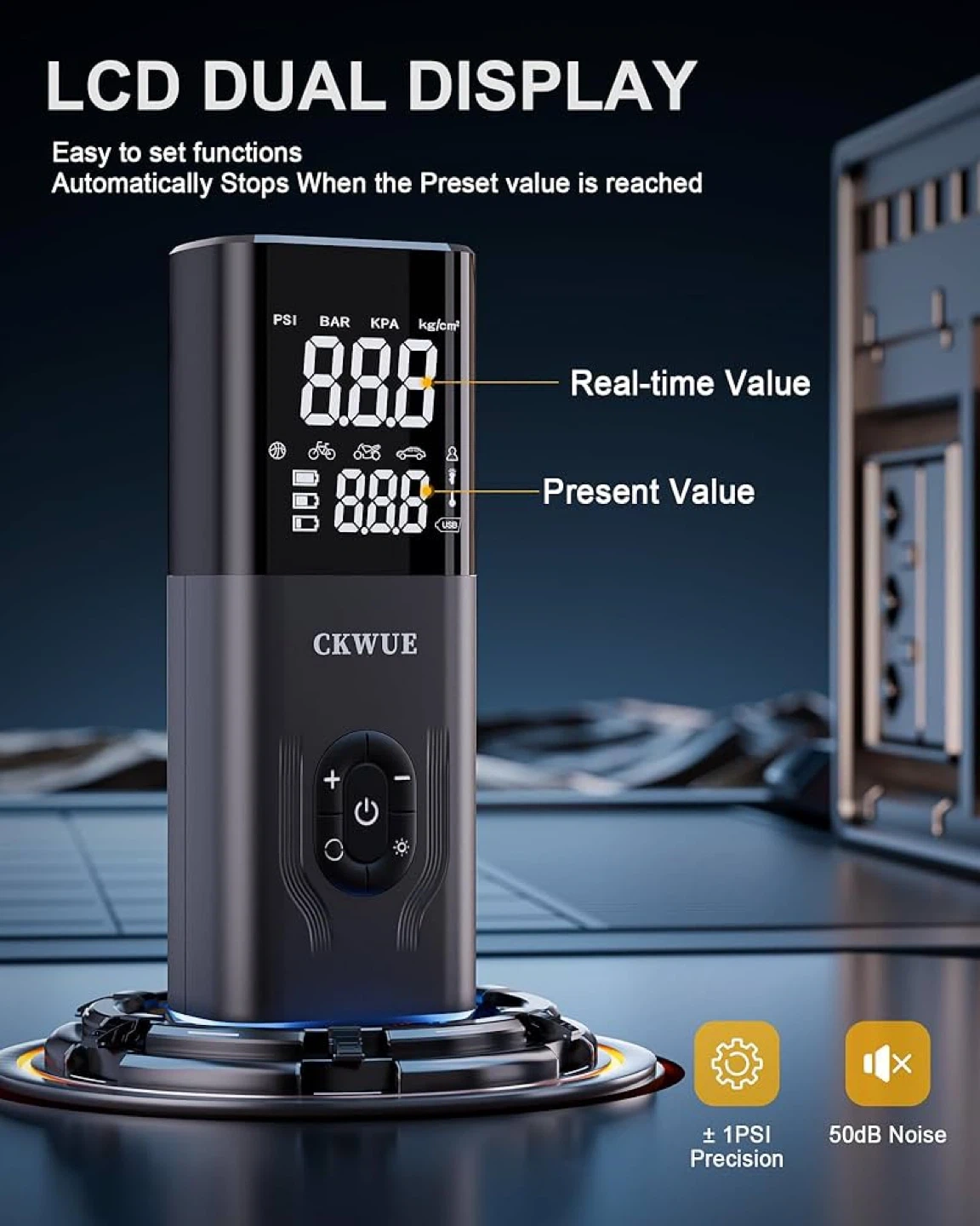 48Selling a brand new CkWue portable tire inflator! It comes in its original box and includes all components. This inflator is easy to use, automatically stops when the preset value is reached, and has a LCD dual display for real-time and present values