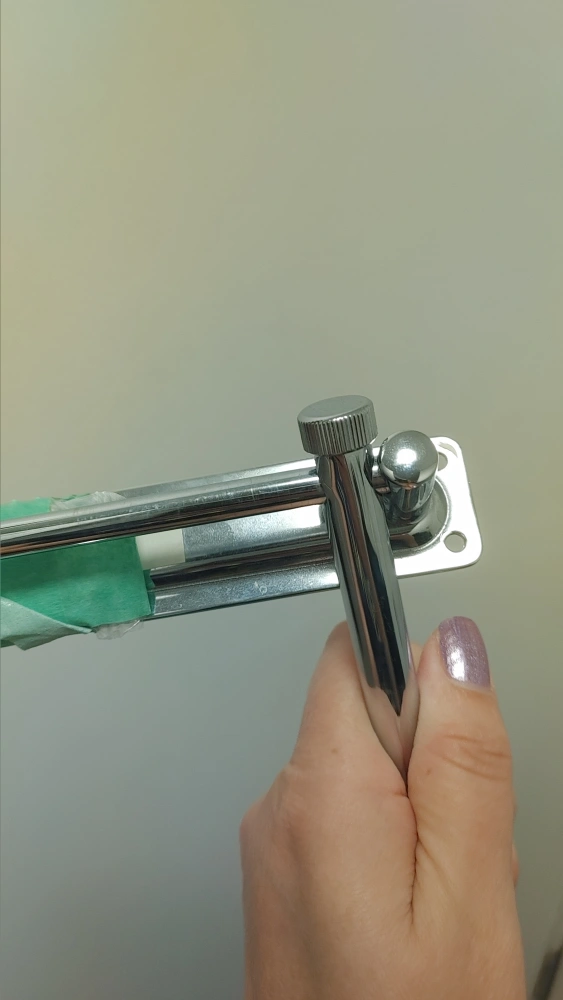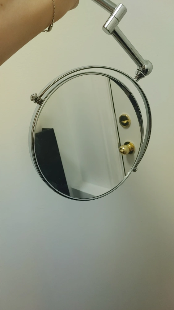 This wall-mounted vanity mirror features a chrome finish and a convenient swivel arm for adjustable positioning. The mirror has a round face and a sturdy metal construction.