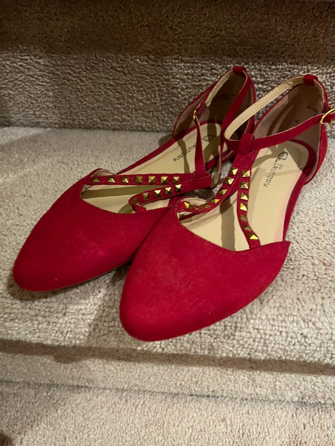 10These cute red flats are by CL by Laundry and are a size 8! They feature a stylish design with gold stud details. Perfect for adding a pop of colour to any outfit!