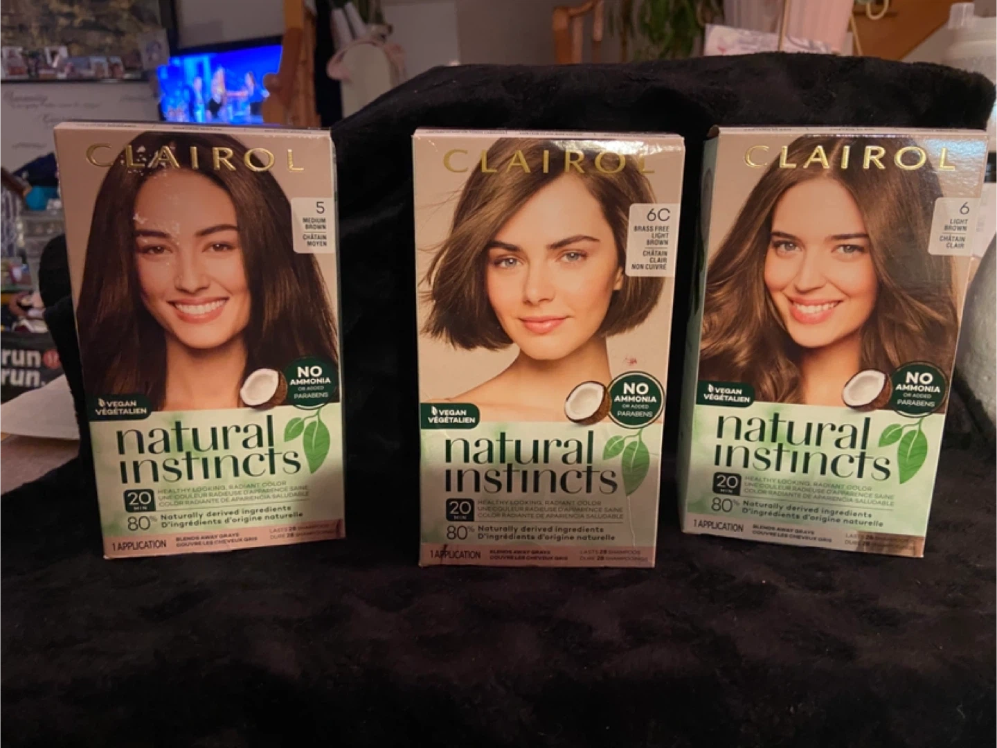 56Brand new - never used - Selling 4 boxes of Clairol Natural Instincts hair dye! - One box of Medium Brown (shade 5) - Two boxes of Brass Free Light Brown (shade 6C) - One box of Light Brown (shade 6) All are vegan and ammonia/paraben free. Each application lasts up to 28 shampoos and blends away grays! Take all 4 for $20 or $5.00 each Pick up in the Maple area - Jane and Teston