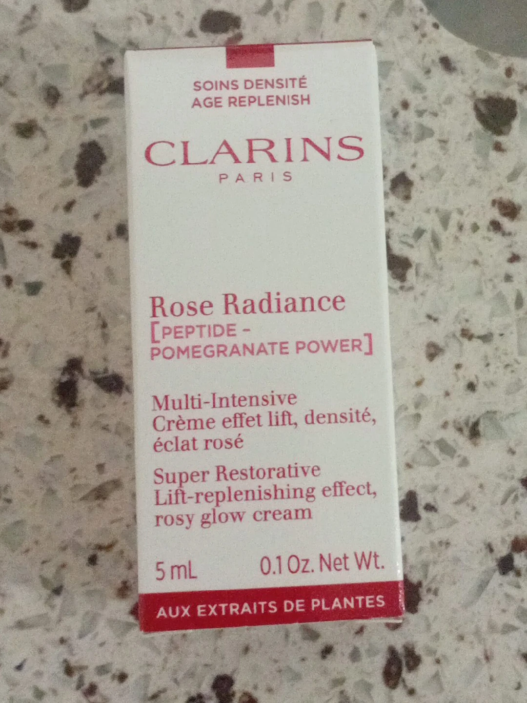 60Selling a Clarins Rose Radiance [PEPTIDE - POMEGRANATE POWER] Multi-Intensive Crème effet lift, densité, éclat rosé. It's a Super Restorative Lift-replenishing effect, rosy glow cream. Size is 5 mL (0.1 Oz. Net Wt.)
