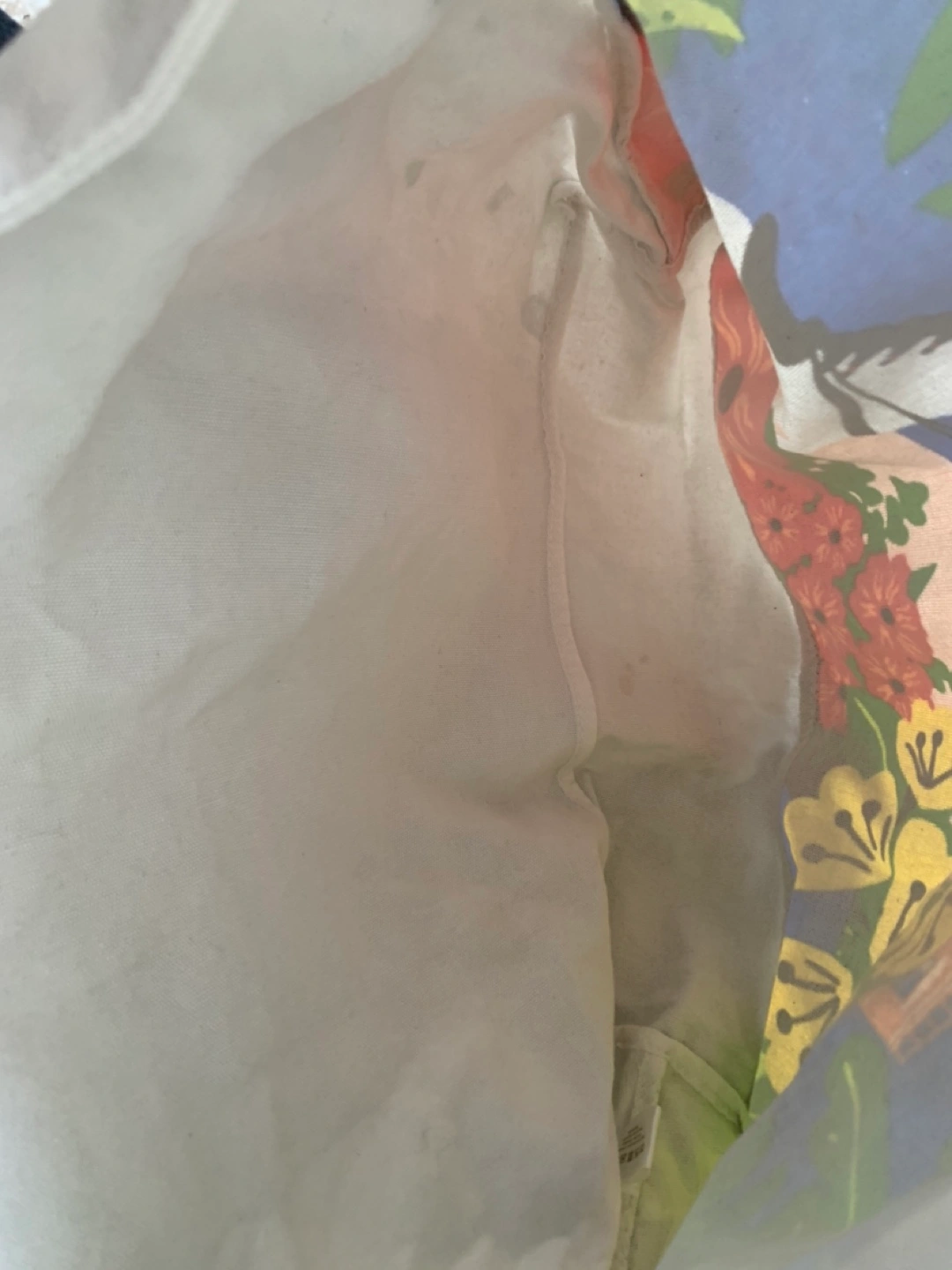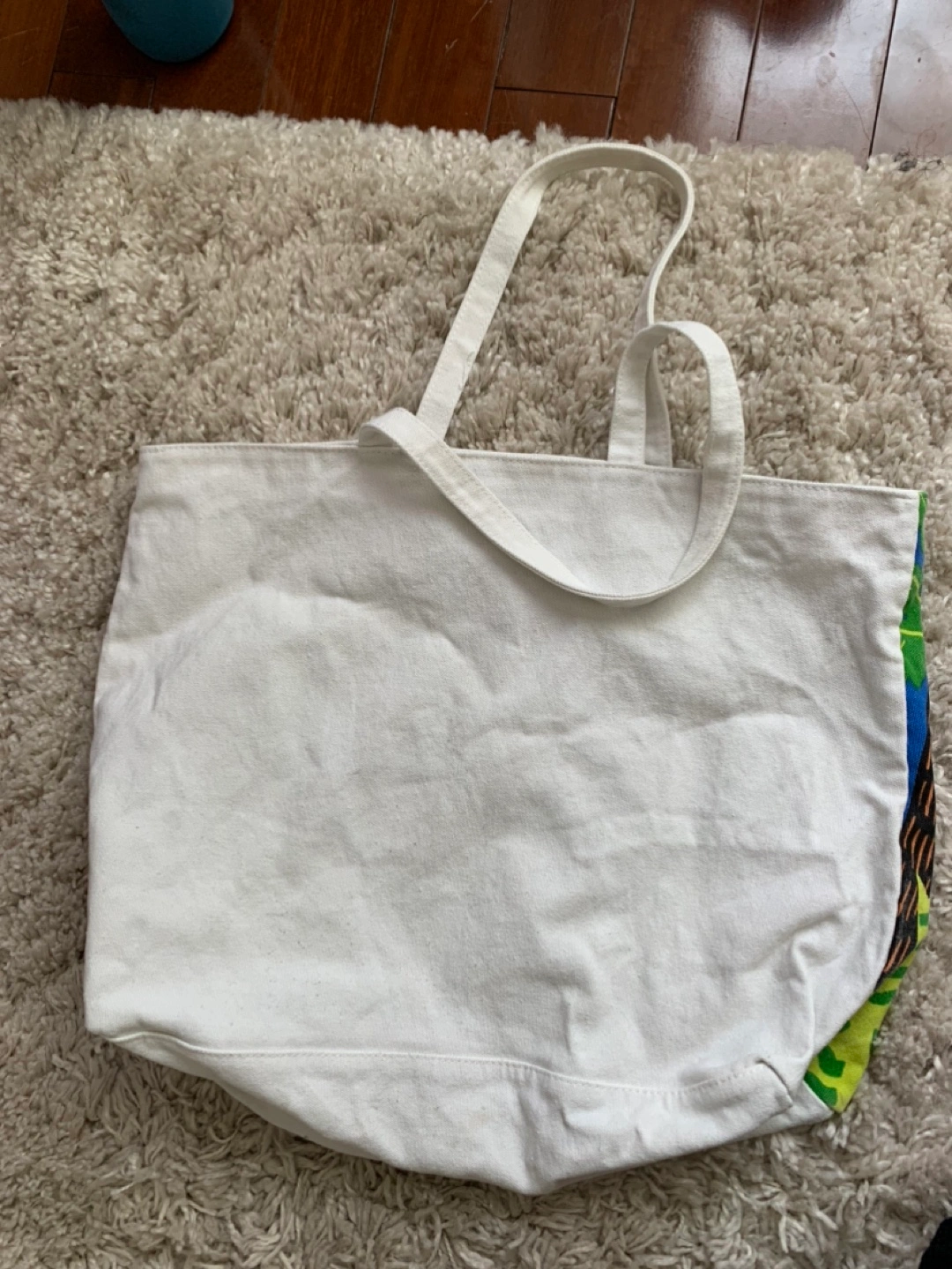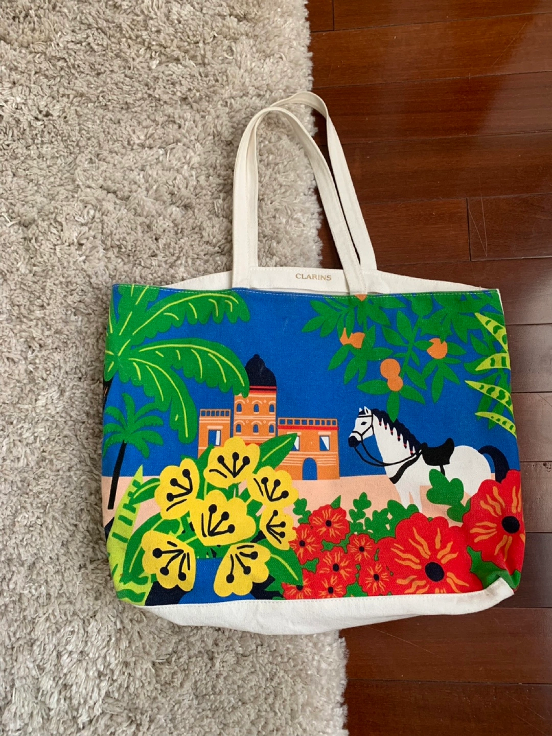 90Here's a cute Clarins tote bag! It's got a colourful design featuring flowers, a horse, and a building. Perfect for carrying your everyday essentials