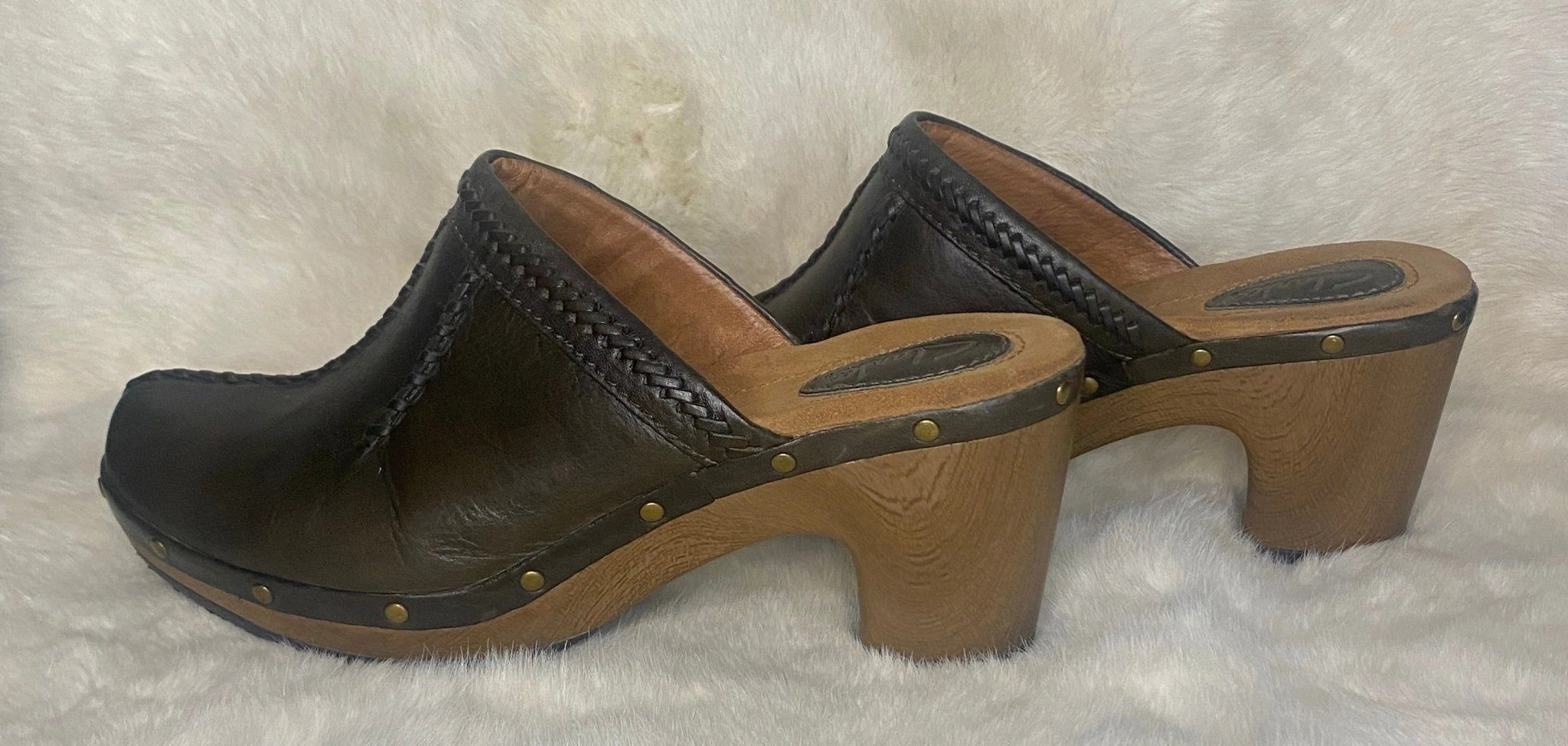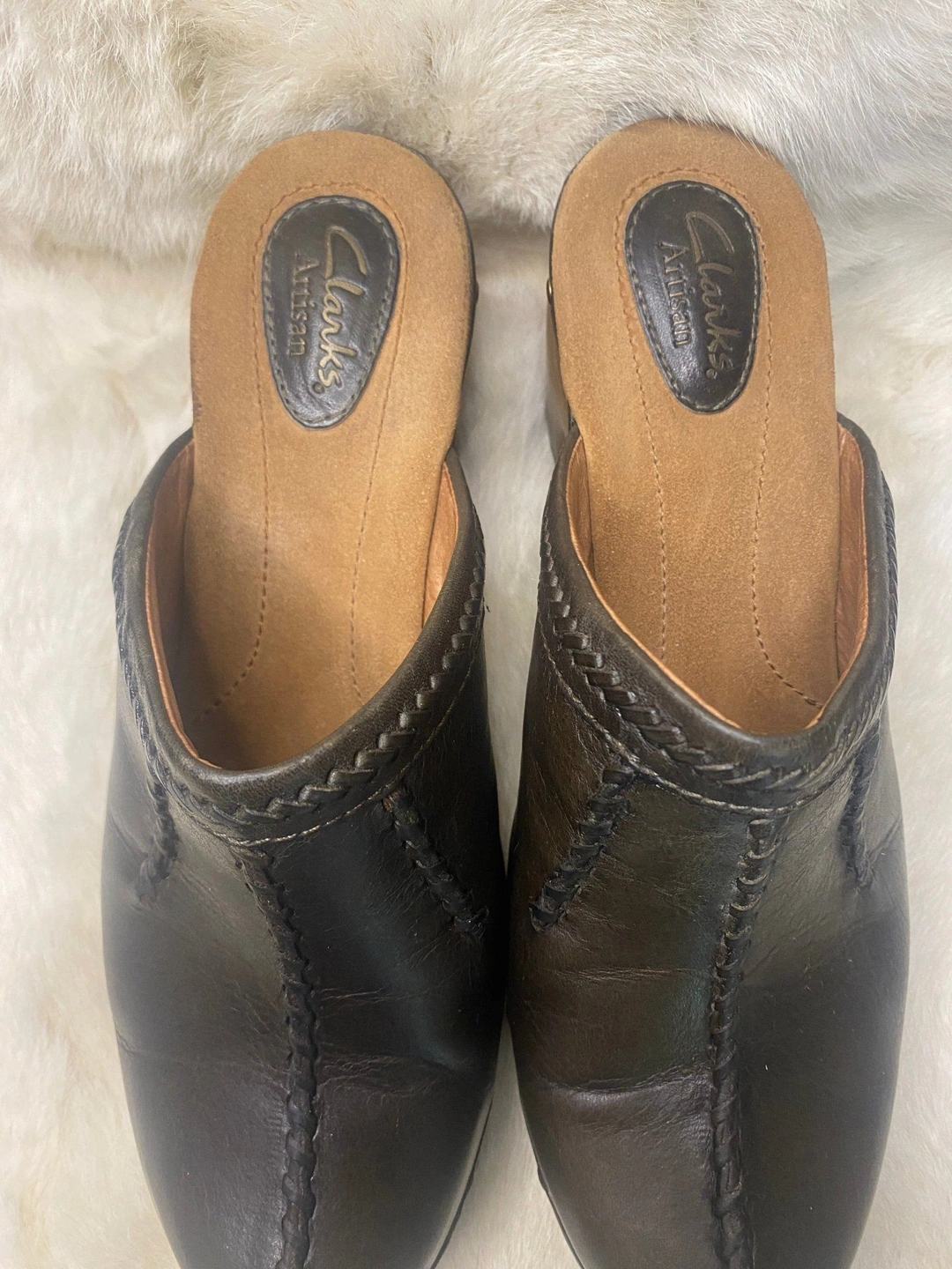 15Style, class, comfort and substance describe these fantastic Clarks Artisan Brown Leather Women's Slip On Shoes Clogs. From the studs to the leather build to the classic open look, these Clarks Artisan Brown Leather clogs will give you that fun yet classic look that accents so many pieces and style options in your wardrobe. Wear them if you are out and about during the day, entertaining guests at your home out out in a bar or club, these Clarks Artisan Brown Leather Women's Slip Clogs will give you that cool yet classic look that will pair well with any wardrobe style option, from a pair of jeans, to a casual skirt to a pair of slacks. These Clarks Artisan Brown Leather Women's Slip On Shoes Clogs are a size US 10M and although pre-owned are in excellent condition with very little signs of use. Local pickup is in Etobicoke near Islington and The Westway. We offer shipping and local delivery for this item. Please send a message about availability and cost associated with these respective services.