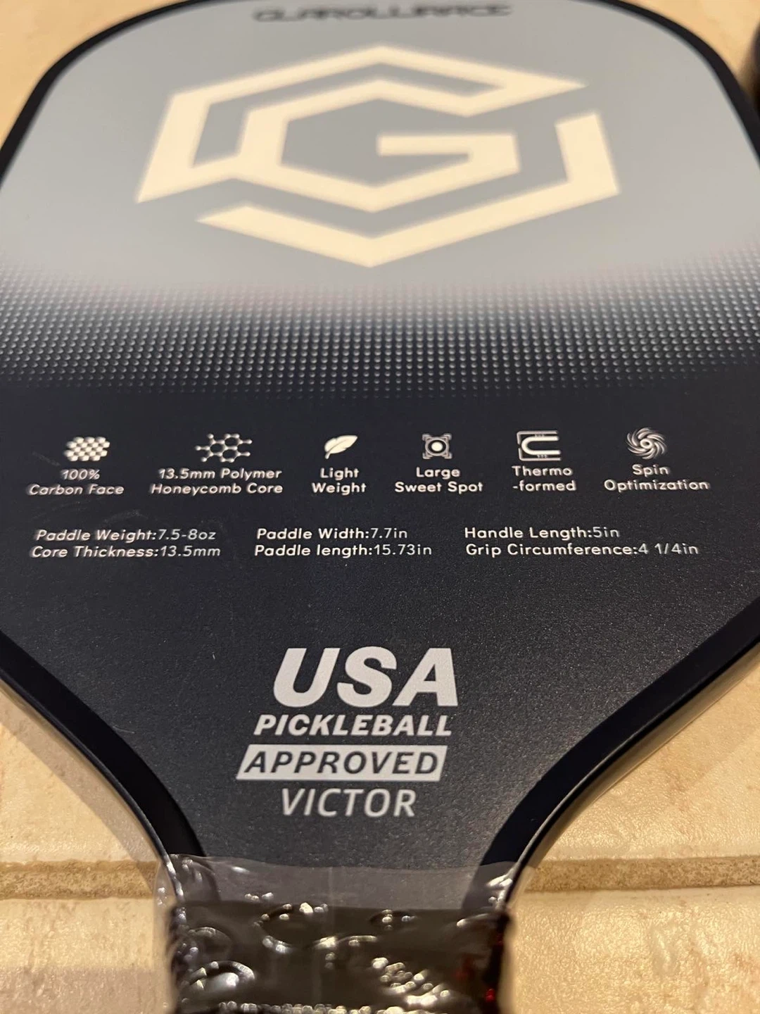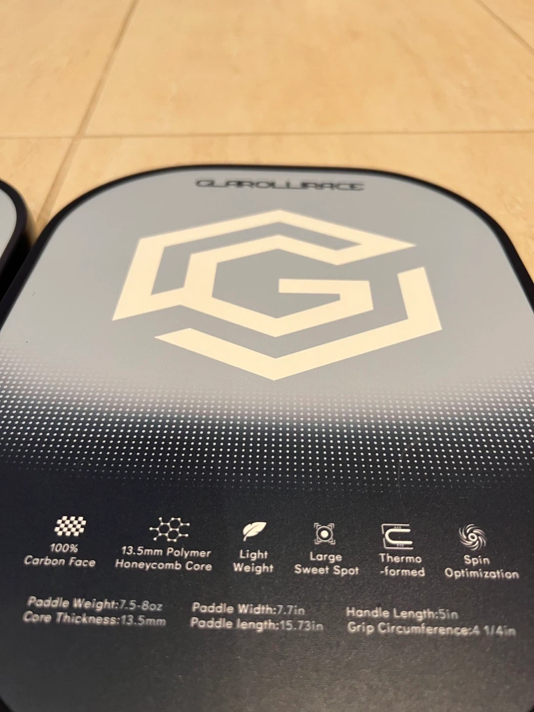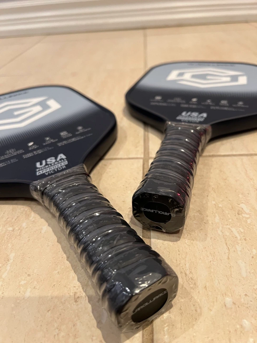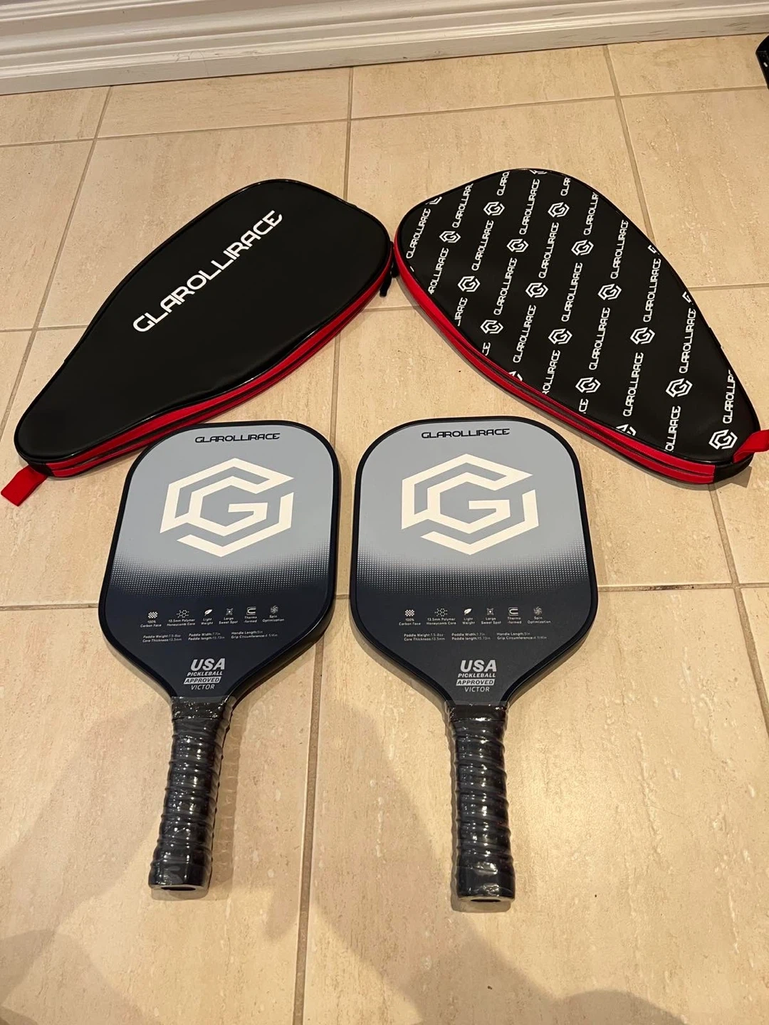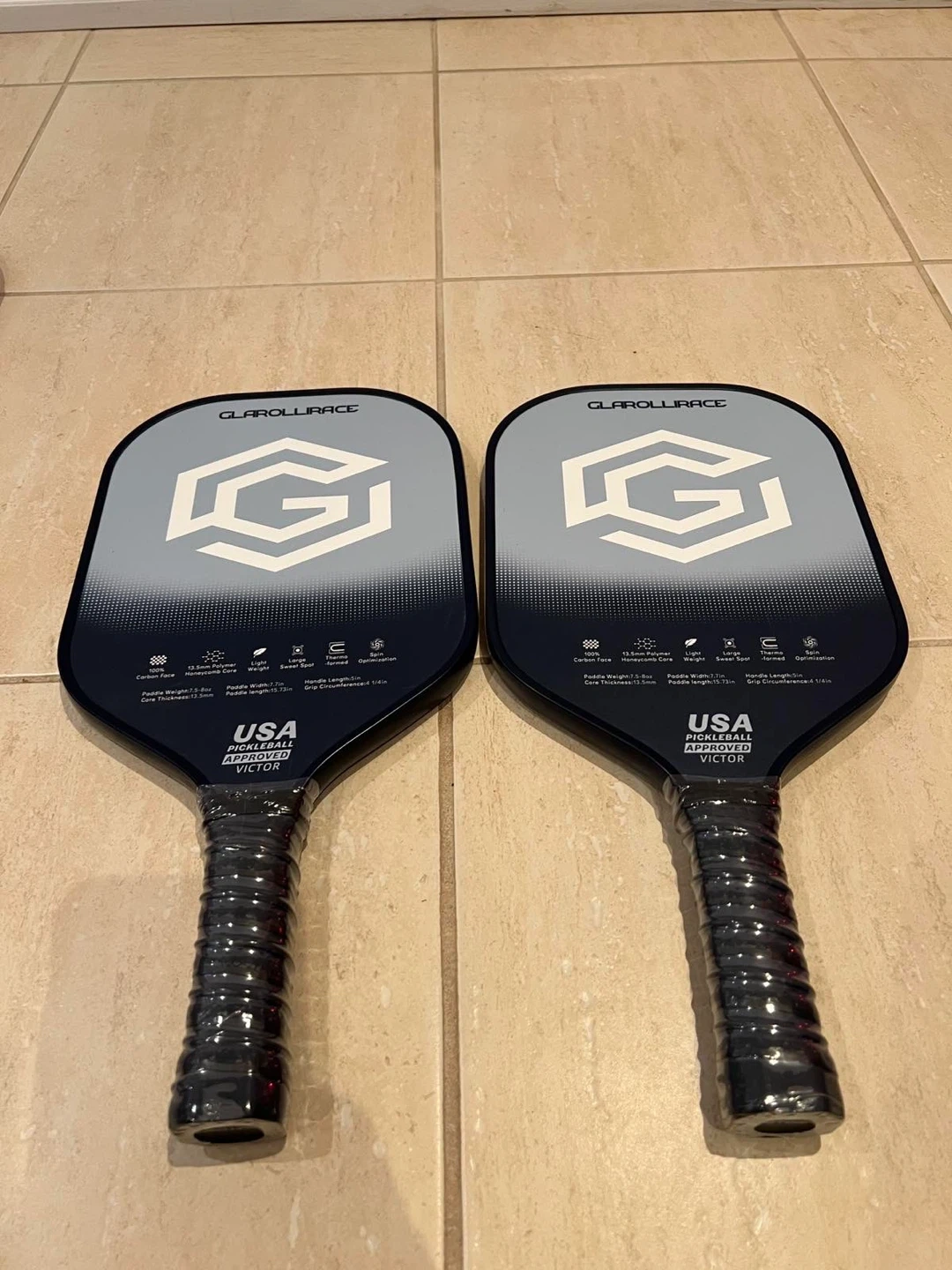 I'm selling a pair of brand new Clarollrace Victor pickleball paddles! They are USA Pickleball Approved. Here are some of the specs: - 100% Carbon Face - 13.5mm Polymer Honeycomb Core - Light Weight - Large Sweet Spot - Thermo-formed - Spin Optimization - Paddle Weight: 7.5-8oz - Core Thickness: 13.5mm - Paddle Width: 7.7in - Paddle Length: 15.73in - Handle Length: 5in - Grip Circumference: 4 1/4in Each paddle comes with its own case!