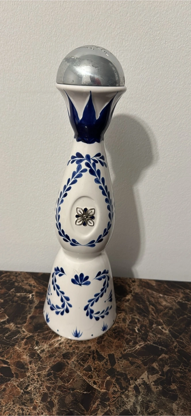 Lovely ceramic decorative item. It features a unique shape with blue and white floral detailing, and has a polished silver cap. You can place this piece on your shelf to give your house a little personality.