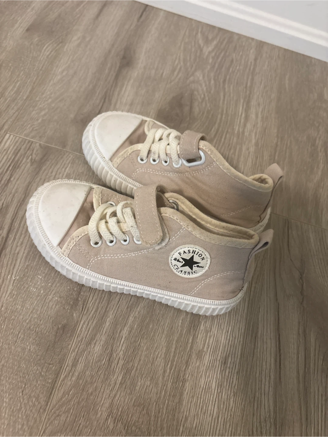 These cute, classic toddler sneakers are in great condition! They feature a beige canvas upper, white toe cap, and a handy velcro strap. Perfect for your little one's everyday adventures. Size 28
