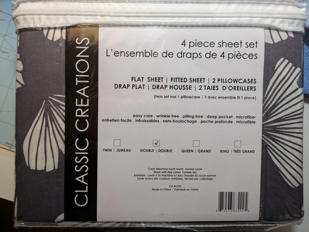 28Unopened. Sealed. Brand new Classic Creations 4-piece double sheet set. It includes a flat sheet, fitted sheet, and two pillowcases. The set is made of microfiber, which is easy care, wrinkle free, and pill resistant. It also features a deep pocket design