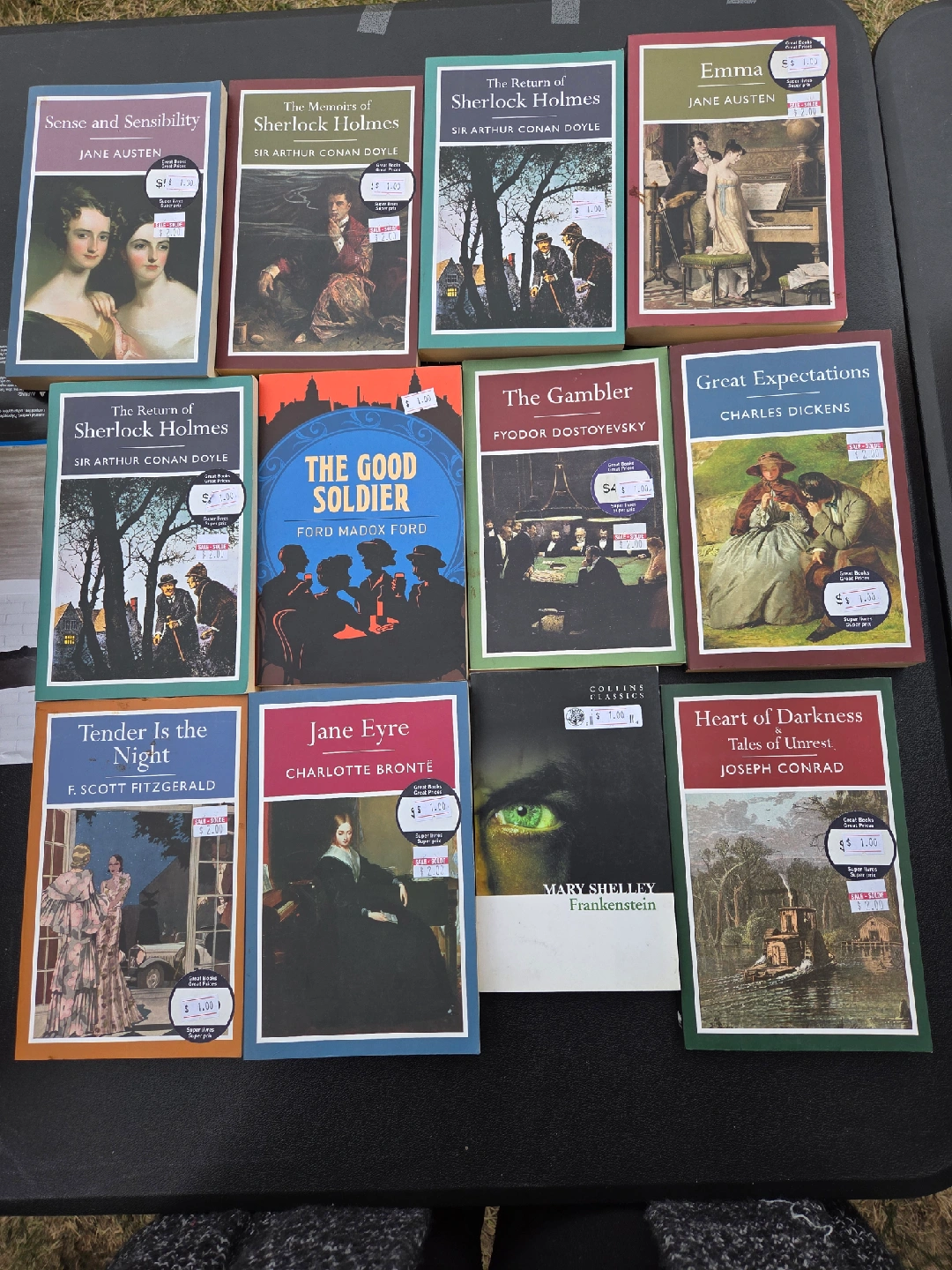 10Selling a collection of classic literature books. Titles include: - Sense and Sensibility by Jane Austen - The Memoirs of Sherlock Holmes by Sir Arthur Conan Doyle - The Return of Sherlock Holmes by Sir Arthur Conan Doyle - Emma by Jane Austen - The Good Soldier by Ford Madox Ford - The Gambler by Fyodor Dostoevsky - Great Expectations by Charles Dickens - Tender Is the Night by F. Scott Fitzgerald - Jane Eyre by Charlotte Brontë - Frankenstein by Mary Shelley - Heart of Darkness by Joseph Conrad Each book is $1