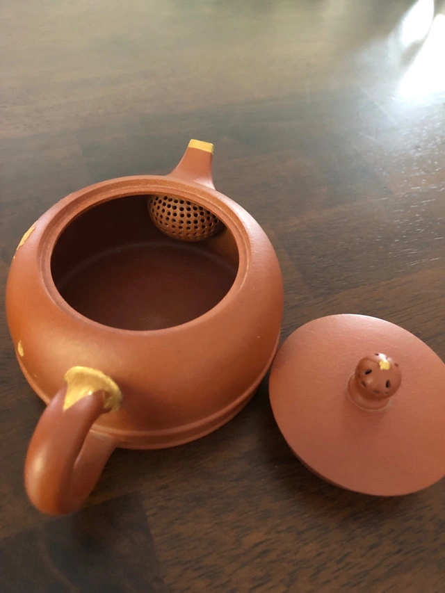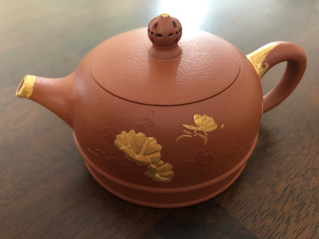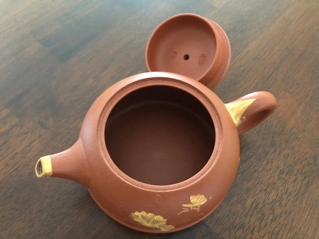 I'm offering a beautiful, used clay teapot featuring intricate gold-coloured floral and butterfly designs, complete with a lid and a built-in strainer. It's in good condition, with a unique stamp on the bottom. I believe this teapot would be great to make some tea! * Material: Clay * Colour: Brown with Gold-Coloured accents * Design: Floral and Butterfly * Includes: Lid and built-in strainer Based on similar listings, I'm pricing this lovely teapot at $35. If the ad is up, it's still available!