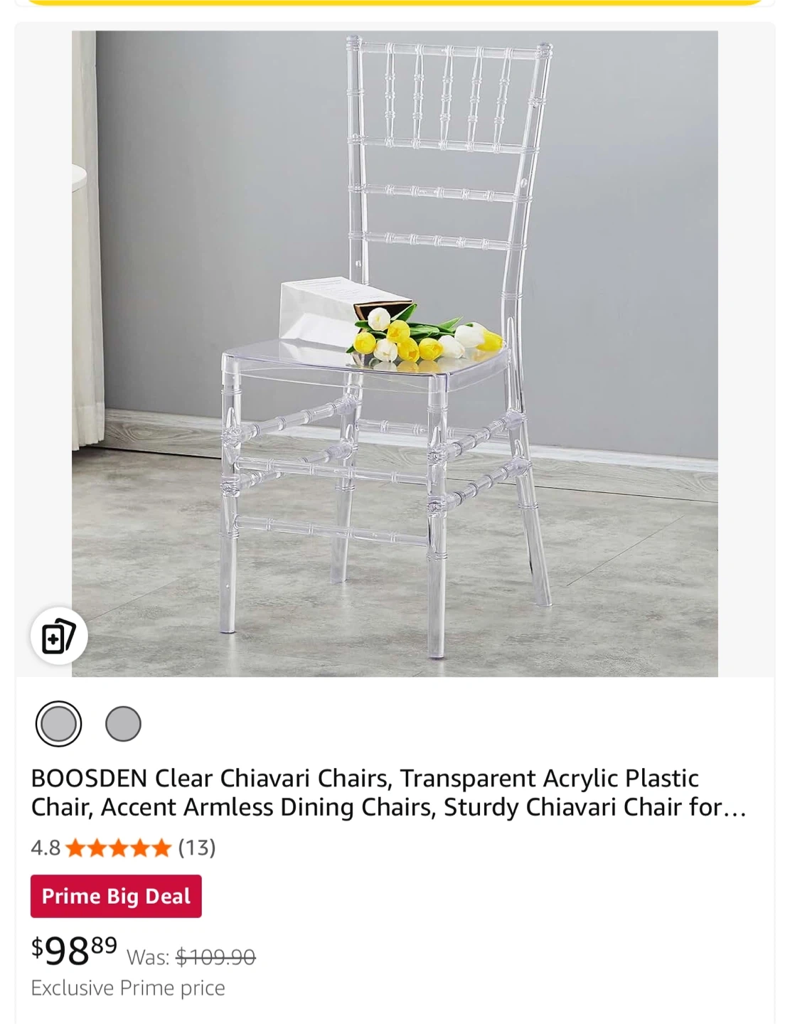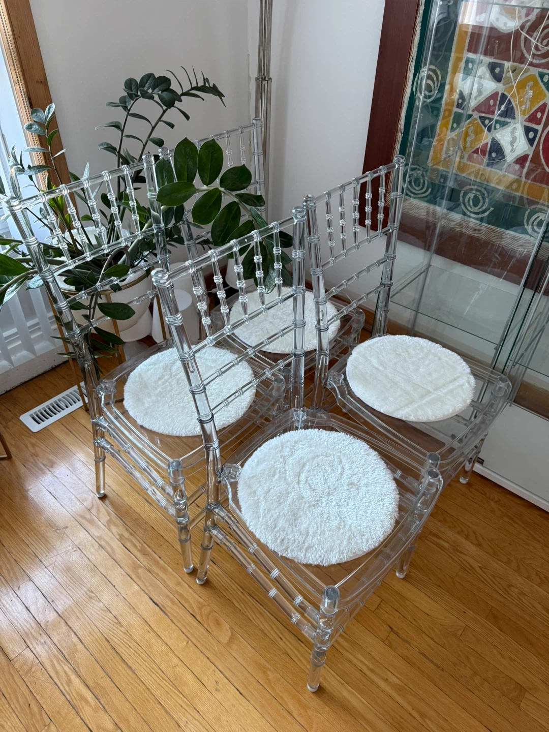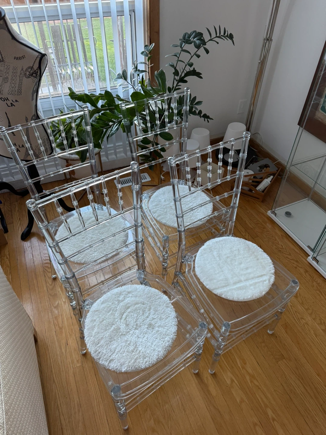 81Selling a set of clear Chiavari chairs. They're in great shape and come with comfy white cushions. Perfect for adding a touch of elegance to your dining space or for special events. Originally bought for $98.89 each