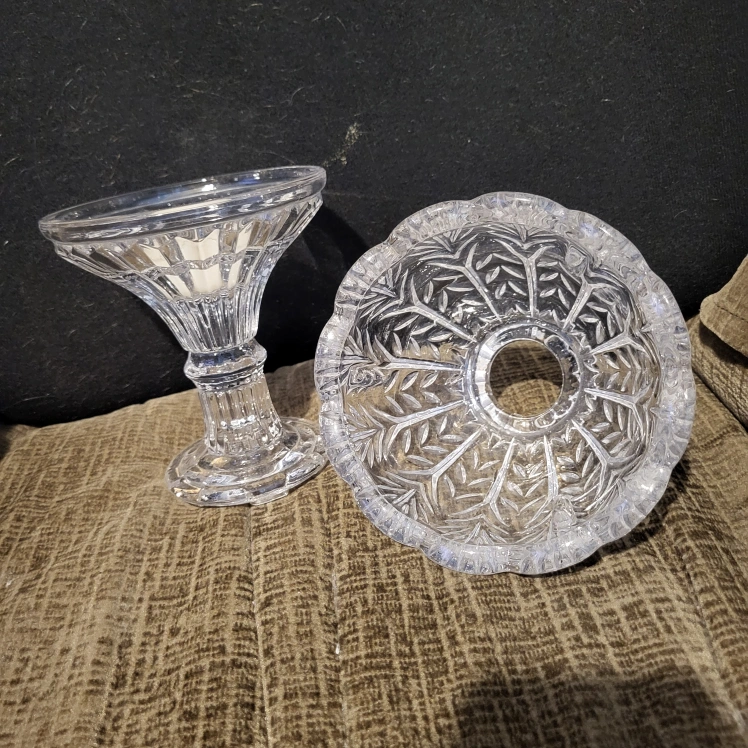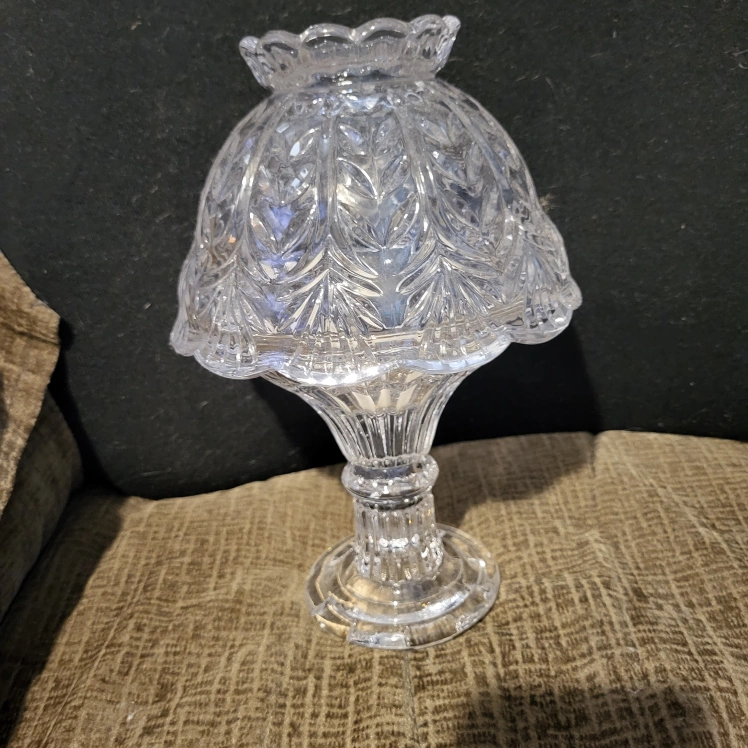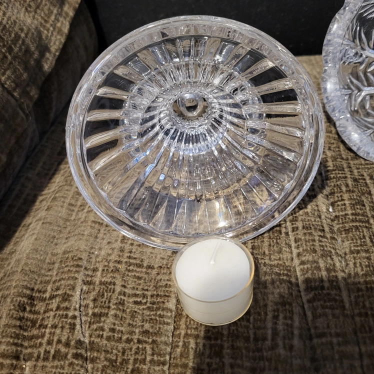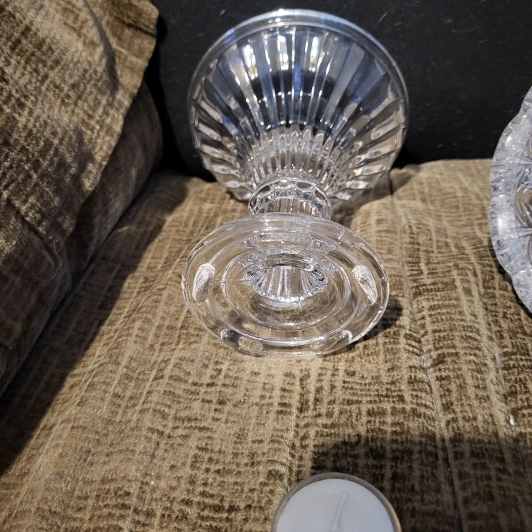 Selling a beautiful clear glass candle holder. It has a lovely, intricate design that would look great in any room. Perfect for creating a cozy atmosphere