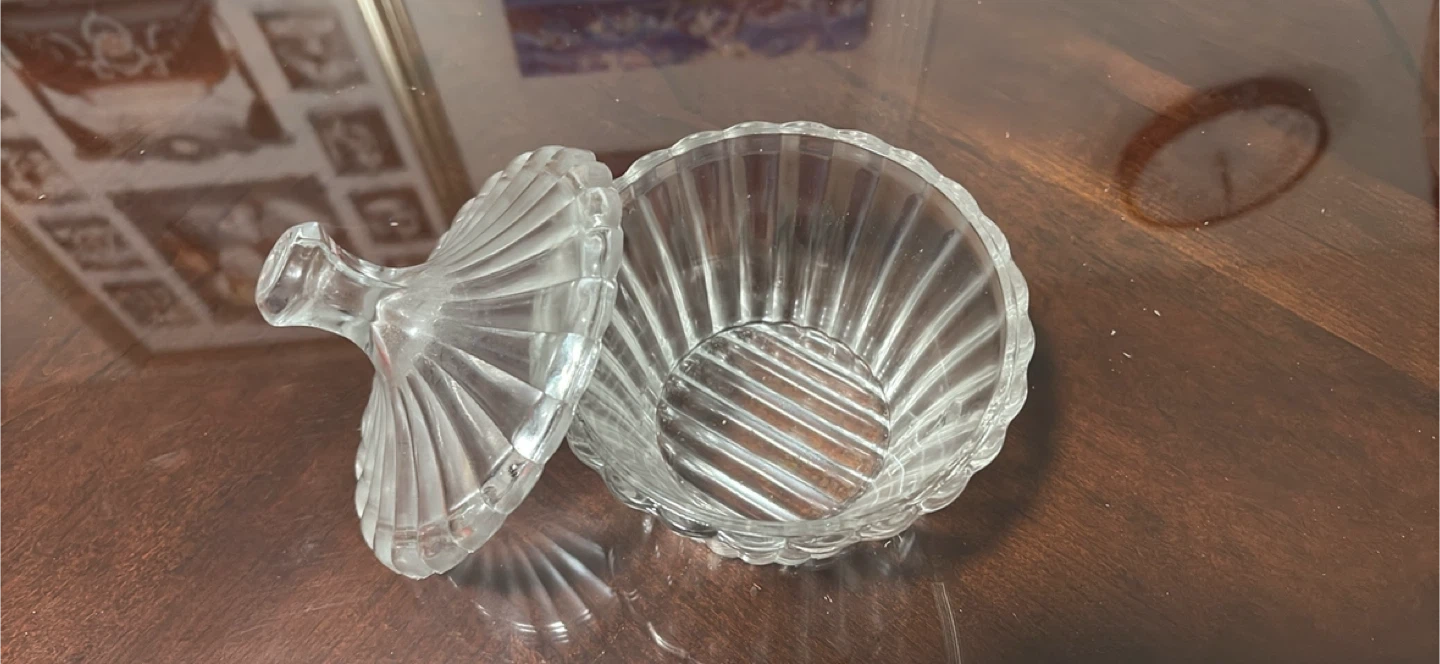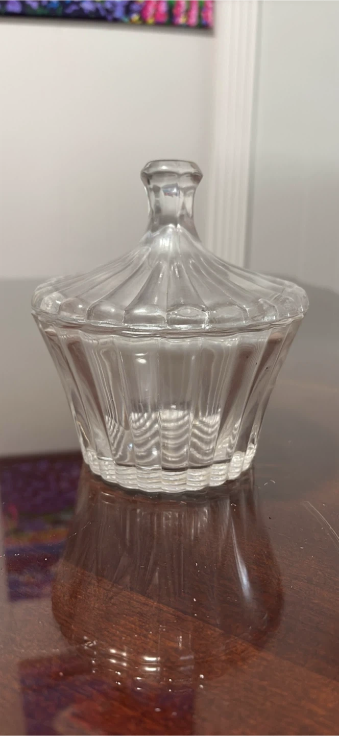 62Here is a clear glass candy dish with a lid. It's in great condition and would look lovely on any table or counter. Perfect for storing candies, small trinkets, or other little treasures