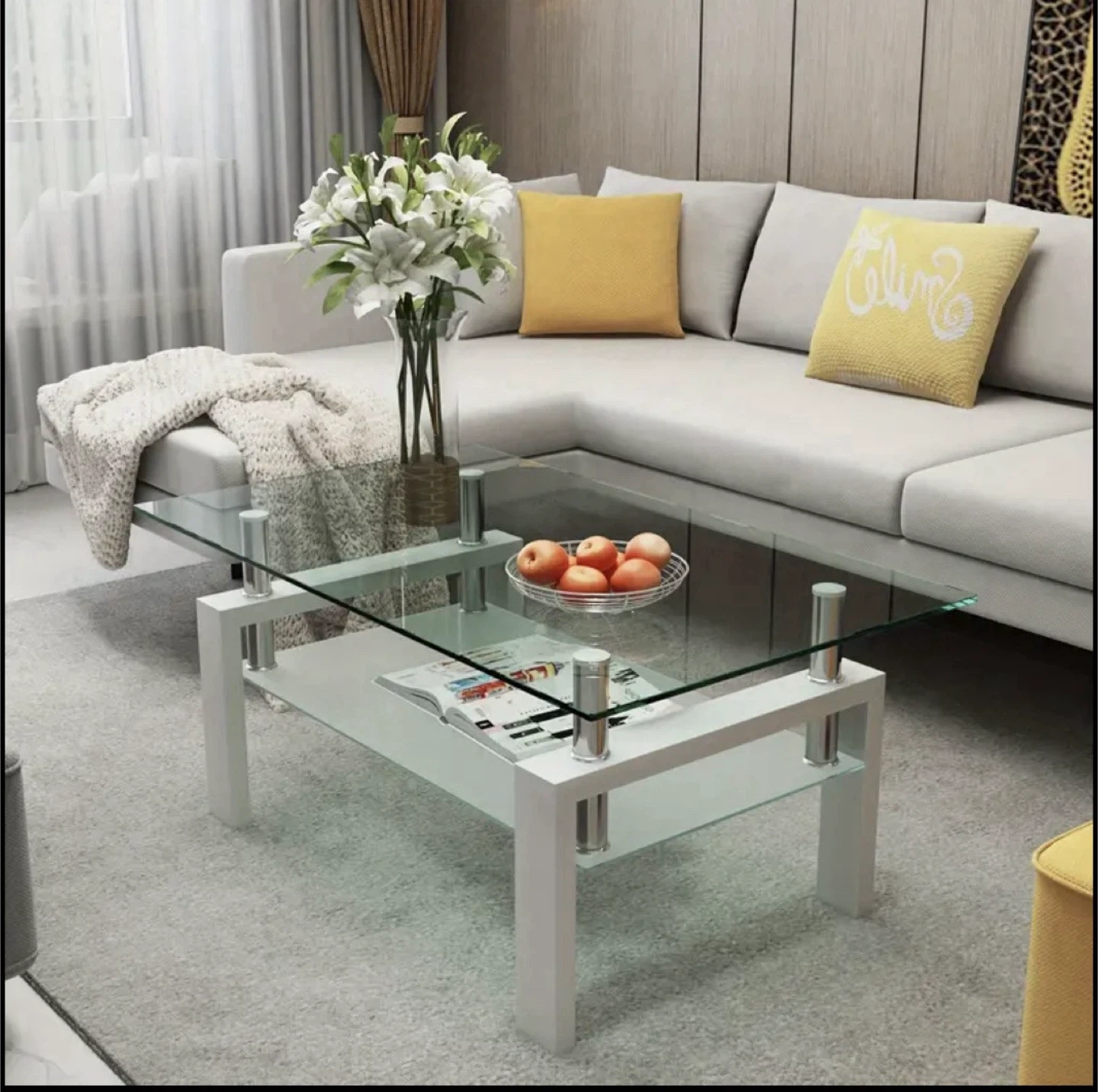 Hardly used for couple of times. Great condition This IANIYA clear glass coffee table is in great condition and would look great in any living room! The metal tube frame is sturdy and stylish. It's a modern white colour, so it'll match any decor