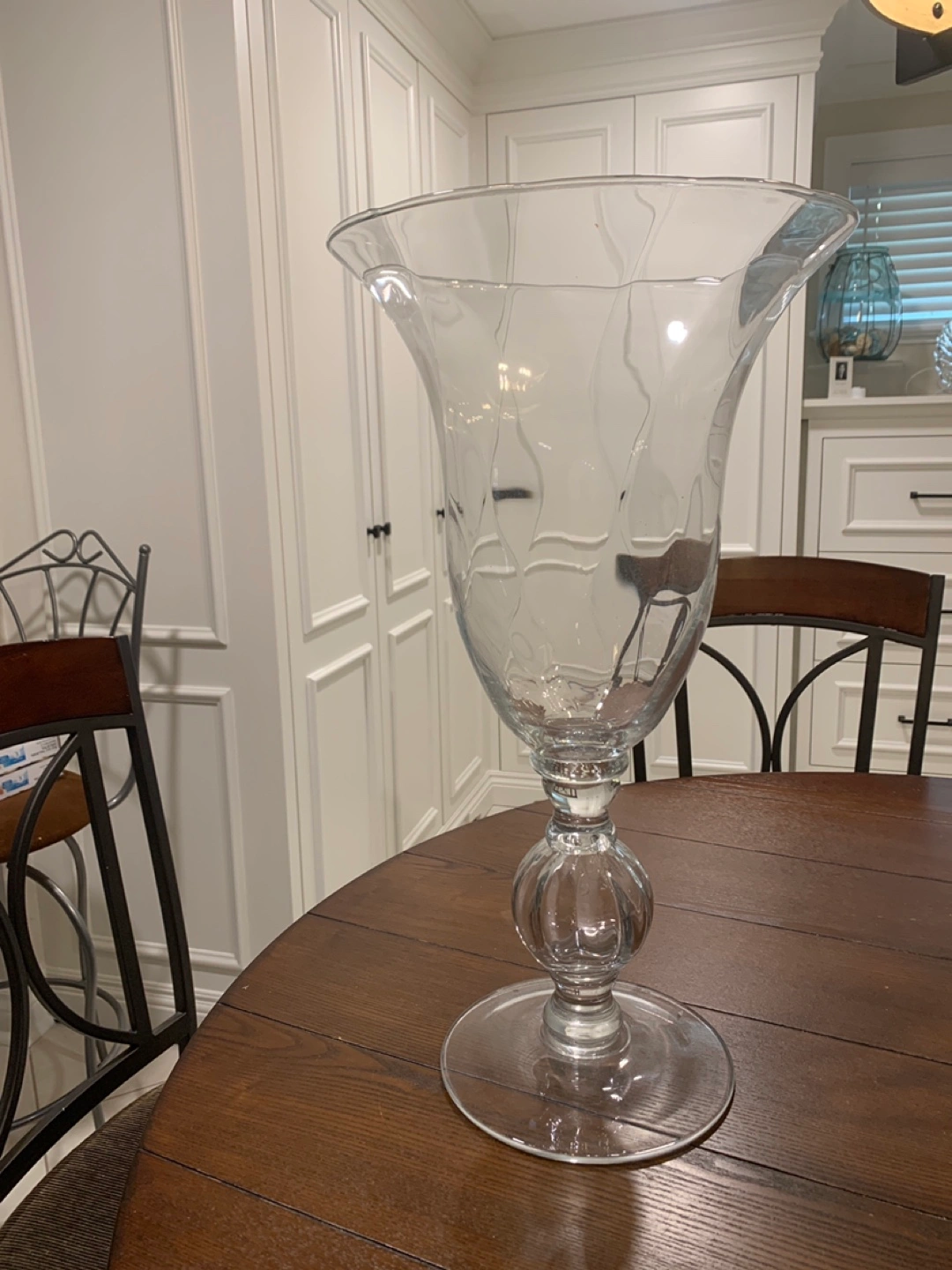 Selling a lovely clear glass vase! It's in great shape and would look beautiful with flowers or as a standalone decorative piece in your home. The vase has a wide opening and a decorative ball-shaped stem. It's perfect for adding a touch of elegance to any room