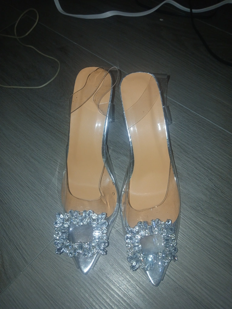 These clear heels are sure to make a statement! They feature a unique geometric heel and a sparkling rhinestone detail on the toe. Perfect for a night out or a special occasion! Its brand new and never used as they are small for me, but perfect for you.