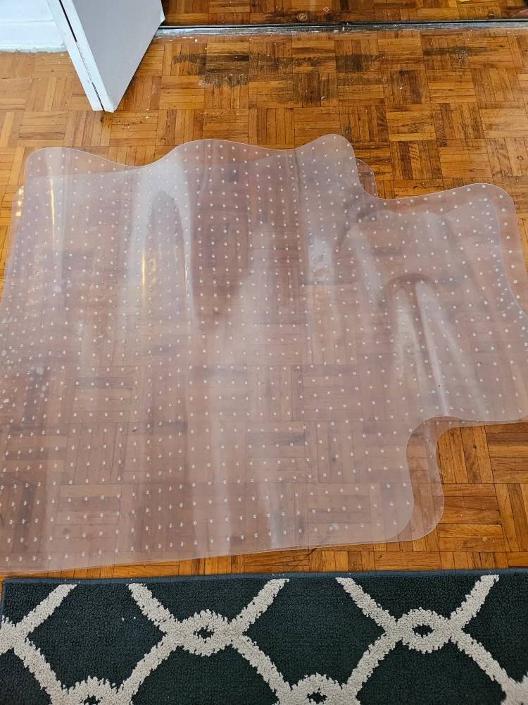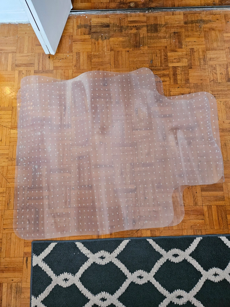 60Large clear office chair mat with a textured surface. Suitable for use on hardwood floors.