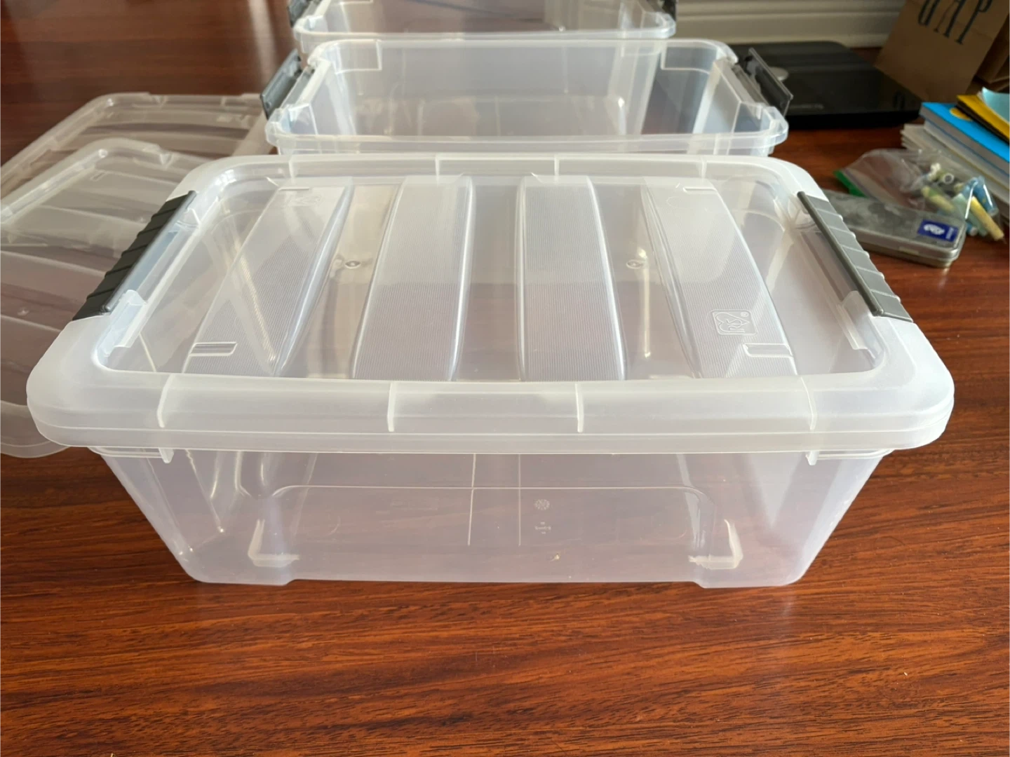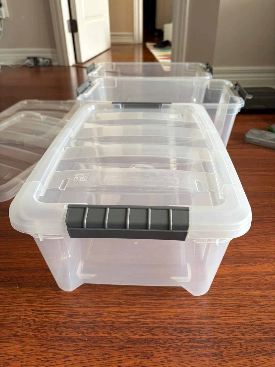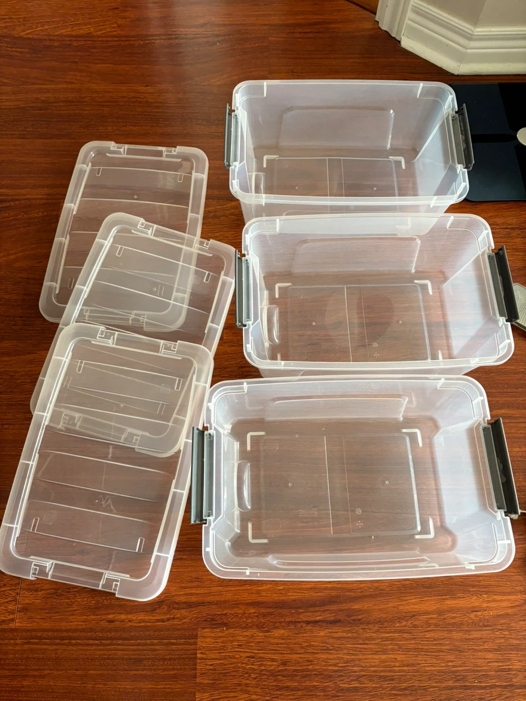 467Selling a set of 3 clear plastic storage bins, complete with lids. These bins are perfect for organizing your home, garage, or office. They're in great shape and ready to help you declutter!