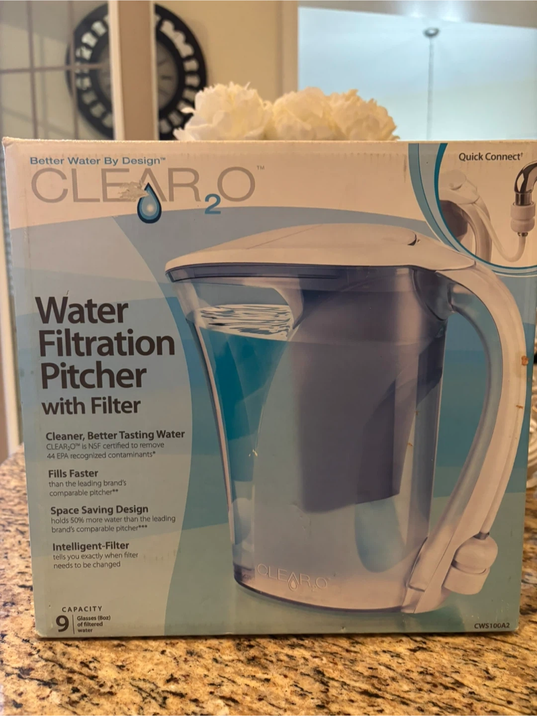 10Selling a CLEAR2O water filtration pitcher with filter! It has a space-saving design that holds 50% more water than comparable pitchers. The intelligent filter tells you exactly when the filter needs to be changed. It holds 9 glasses (8oz) of filtered water