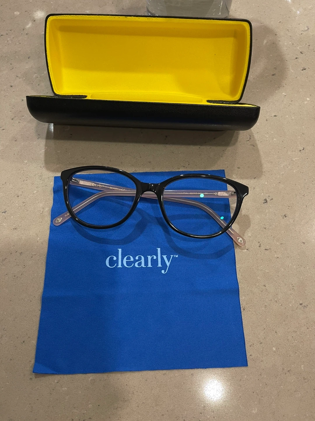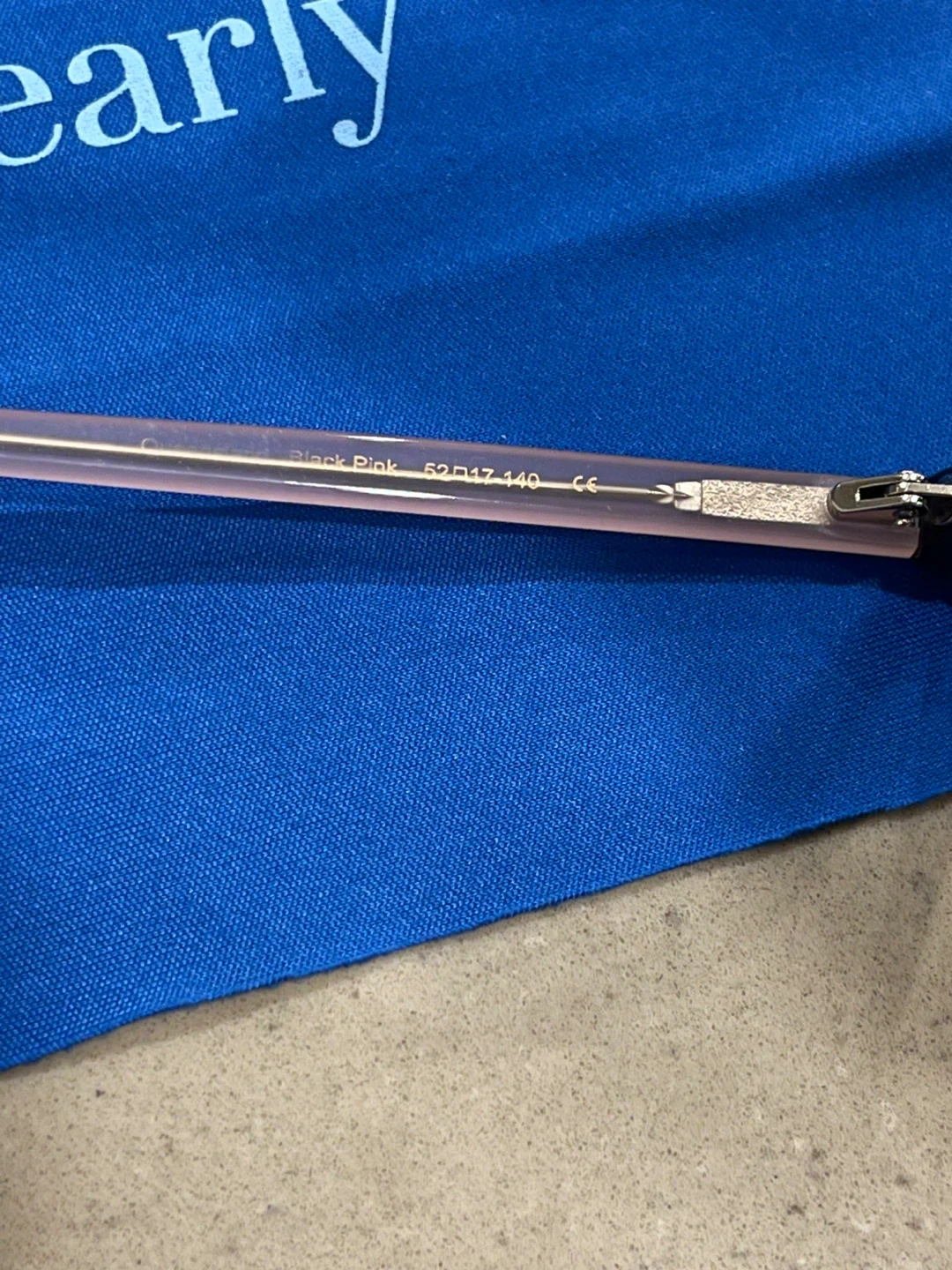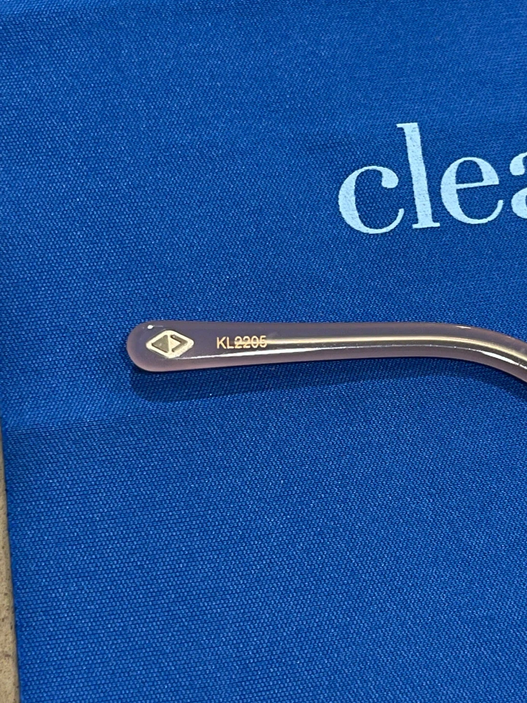 Selling a pair of Clearly glasses, model KL2205. They feature a stylish black frame with a subtle pink accent. The size is 52-17-140. Comes with the original case and cleaning cloth!
