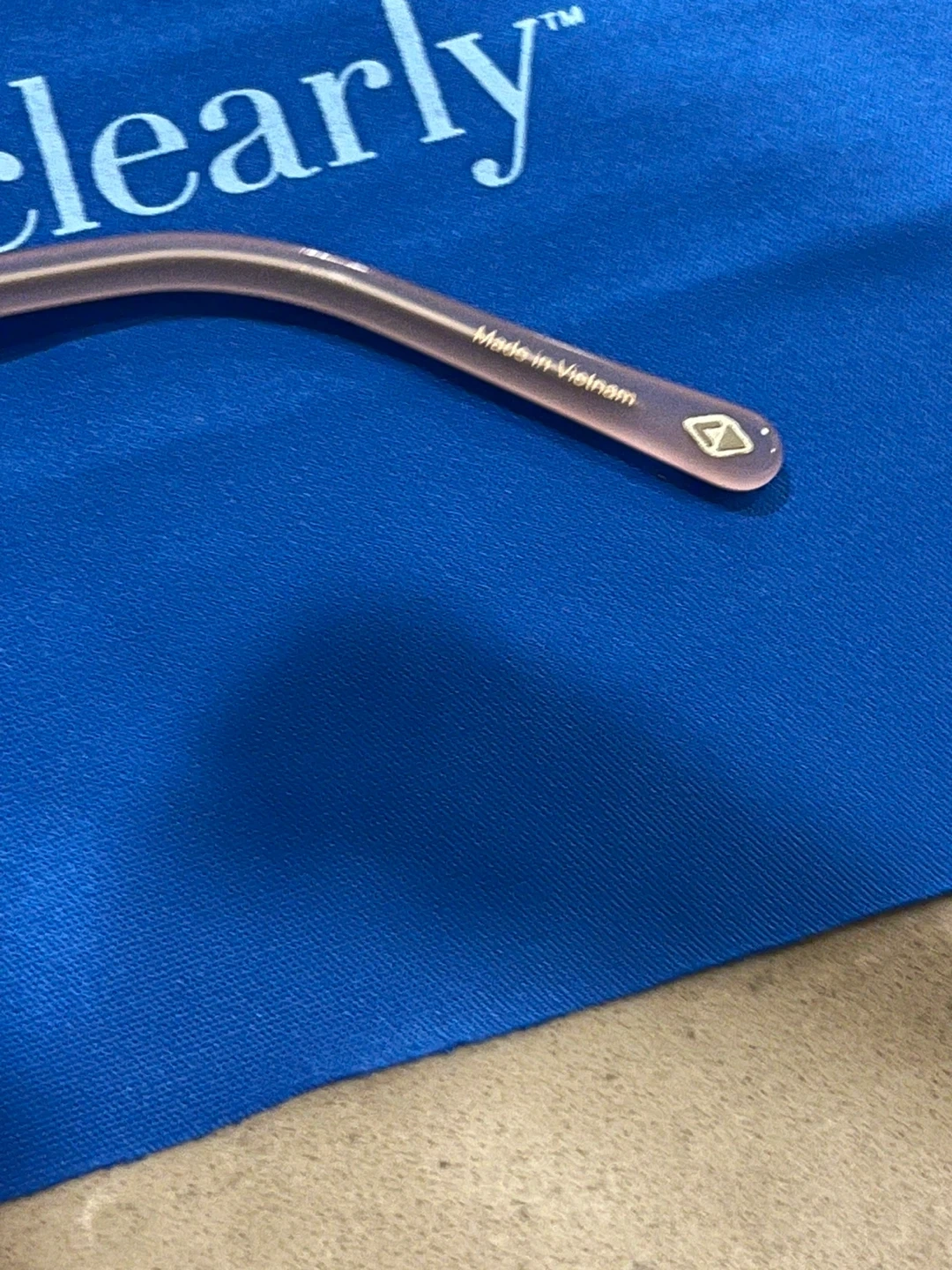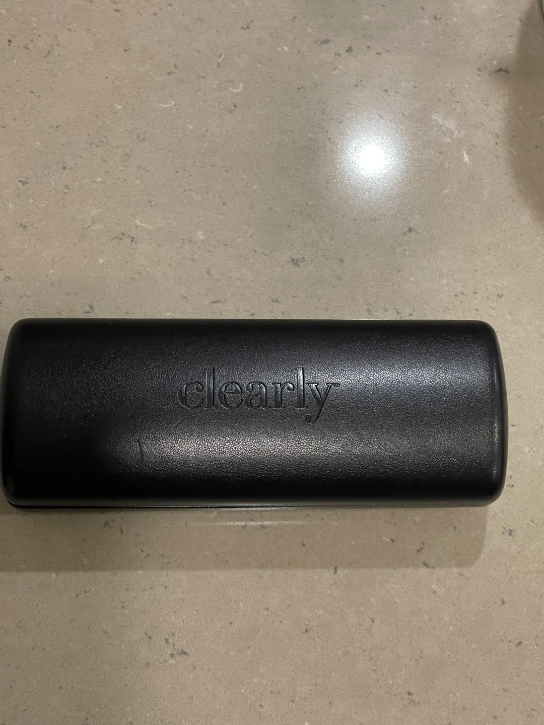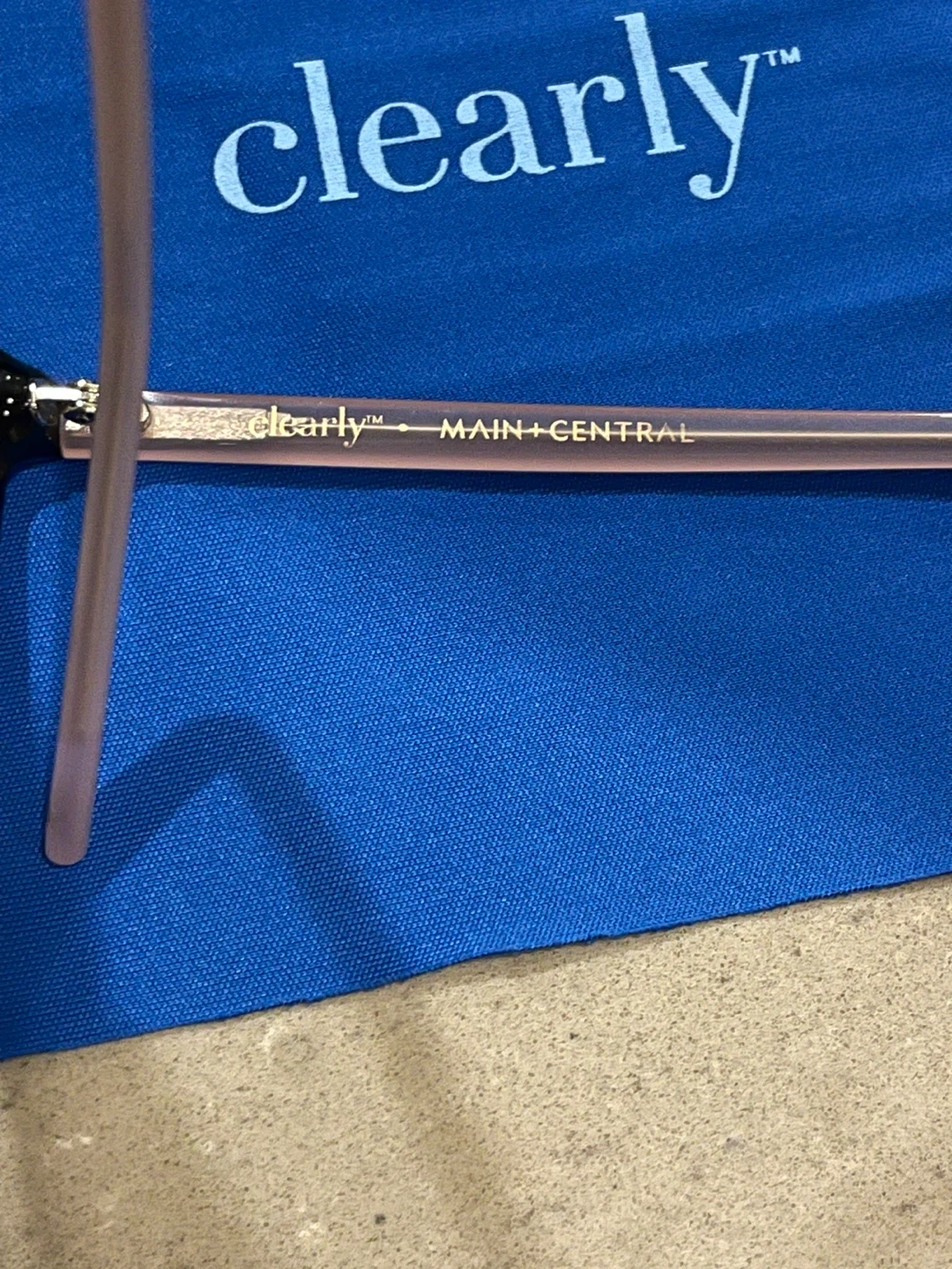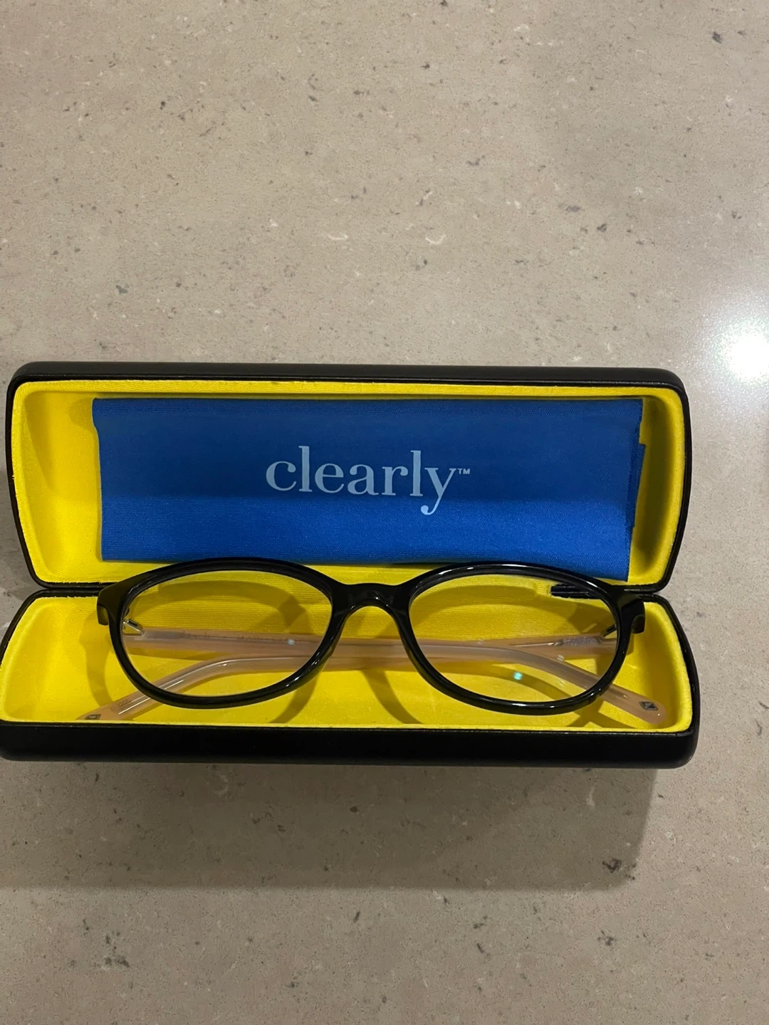 Selling a pair of Clearly glasses, model KL2205. They feature a stylish black frame with a subtle pink accent. The size is 52-17-140. Comes with the original case and cleaning cloth!