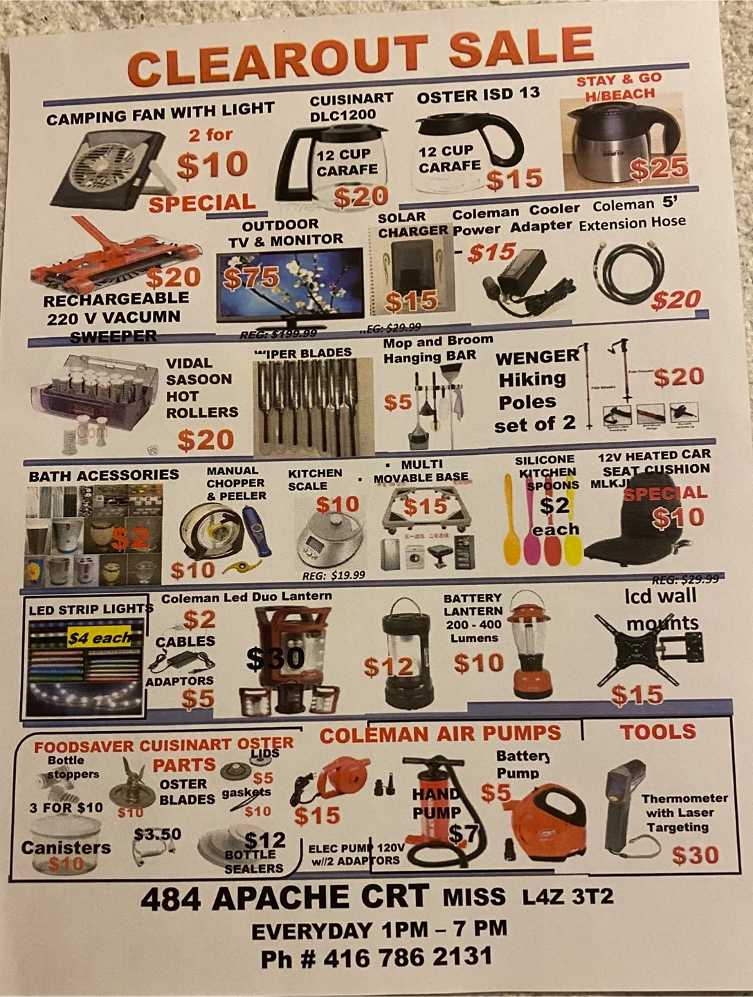 Lots of items for sale! Check out the camping fan with light (2 for $10), Cuisinart & Oster 12-cup carafes ($20 & $15), outdoor TV & monitor ($75), and a rechargeable 220V vacuum sweeper ($20). Also available: solar charger, power adapter, extension hose ($15), mop and broom hanging bar ($5), and much more!
