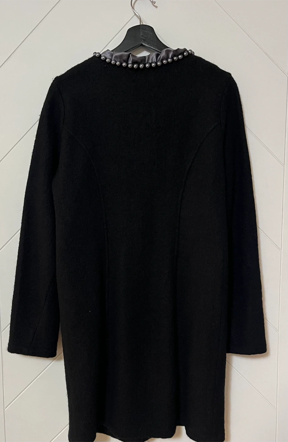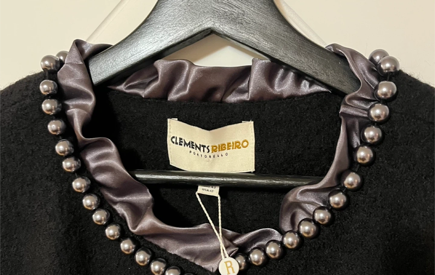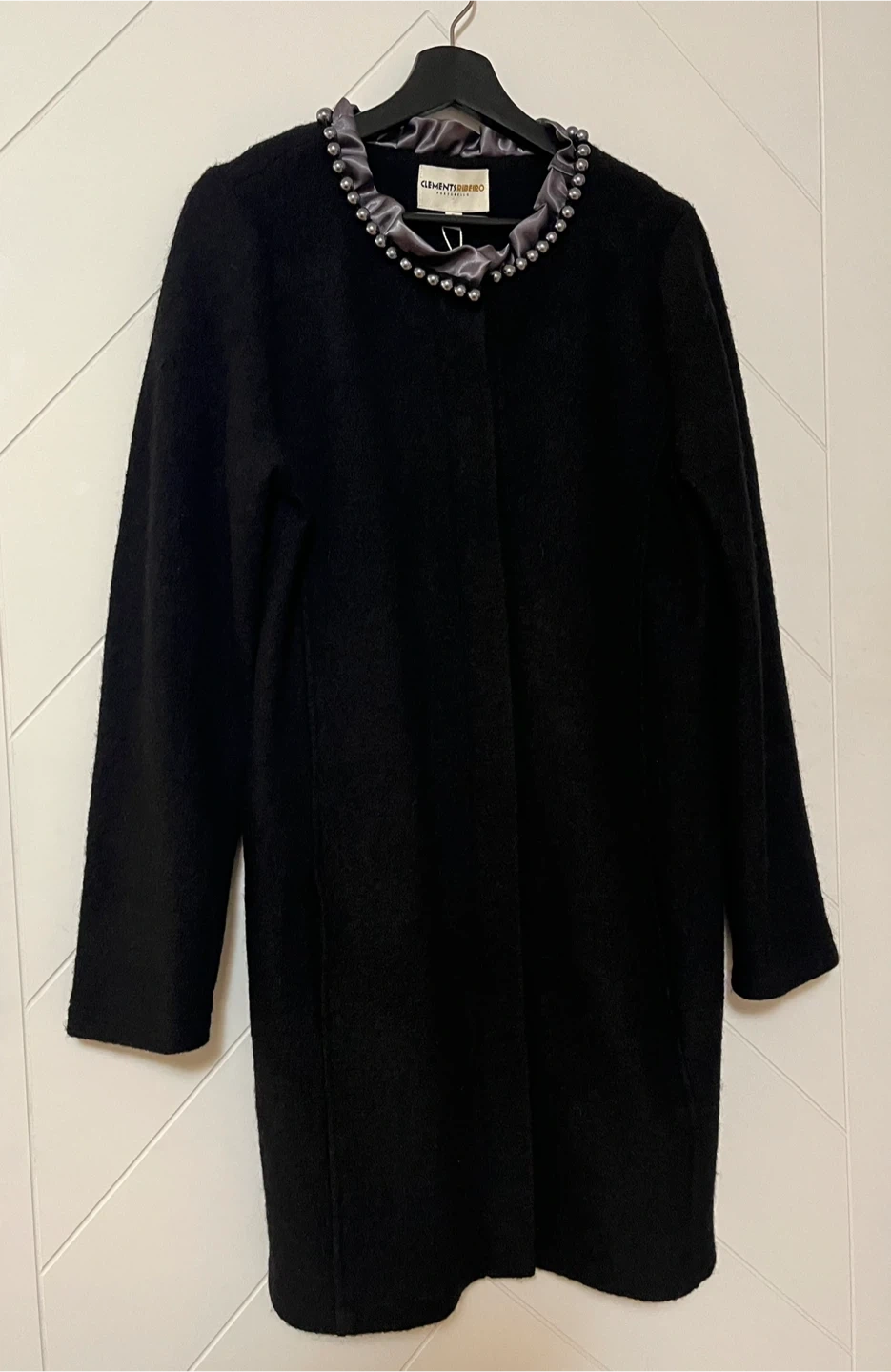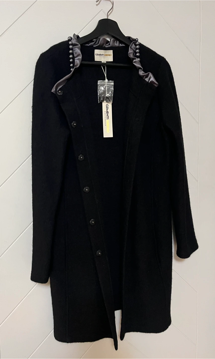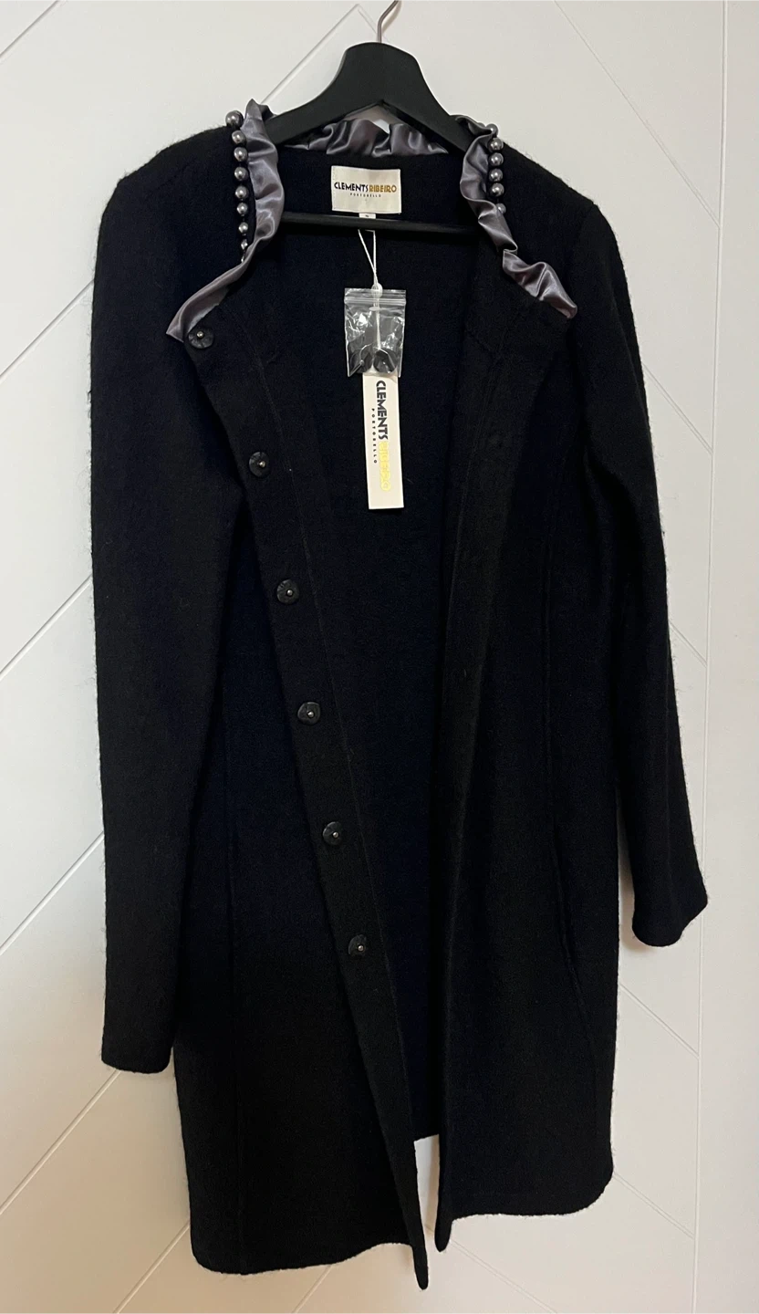 Elegant, luxurious & fashionable black coat from designer Clements Ribeiro It features a unique design with pearl detailing around the collar New With Tag Women Size M-L Pick Up Bloor and Islington Etobicoke
