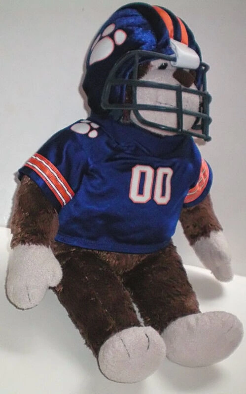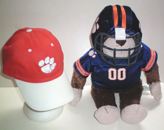 Clemson Tigers Football Plush Talking Monkey and Cap Set. Clemson Tigers Plush Talking Monkey Football Souvenir - Magnificent Monkey from Build A Bear Workshop Inc. is wearing an authentic teddy bear size Clemson Tigers -Double Zero football uniform - just like the college ranks with a jersey and monogrammed helmet. Makes a great gift for the Clemson Tiger Football fan that you know! - The monkey also makes monkey sounds with the push of a button hidden in its left arm. - In as new condition. Clemson Tigers Adjustable Cap - By Colosseum Athletics - Color: Orange cap with white brim and white Clemson embroidered tiger claw logo on front - Colosseum logo on side - Clemson on back - Collegiate Licensed Product NCAA - Embroidered eyelets - Metal buckle clasp - New without paper tags. A very nice set to give or get to show support for your team. Feel free to message if you have any questions!