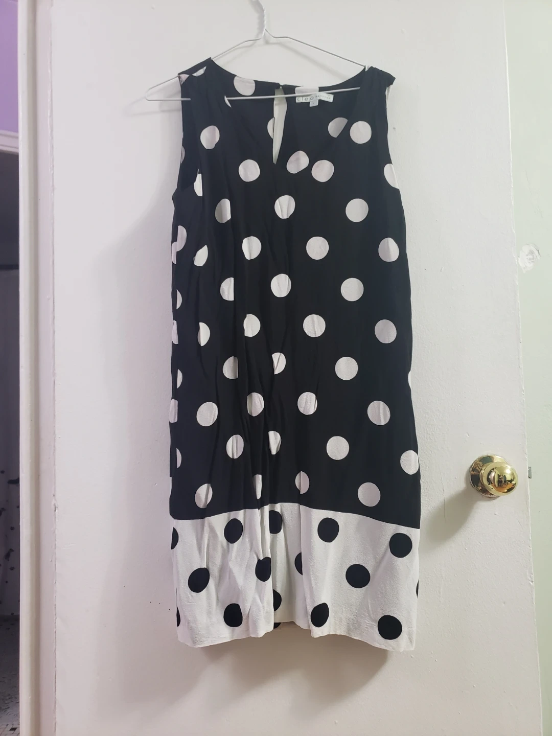 695Adorable sleeveless summer dress. Black and white polka dot pattern. Colour block design. Size 4.