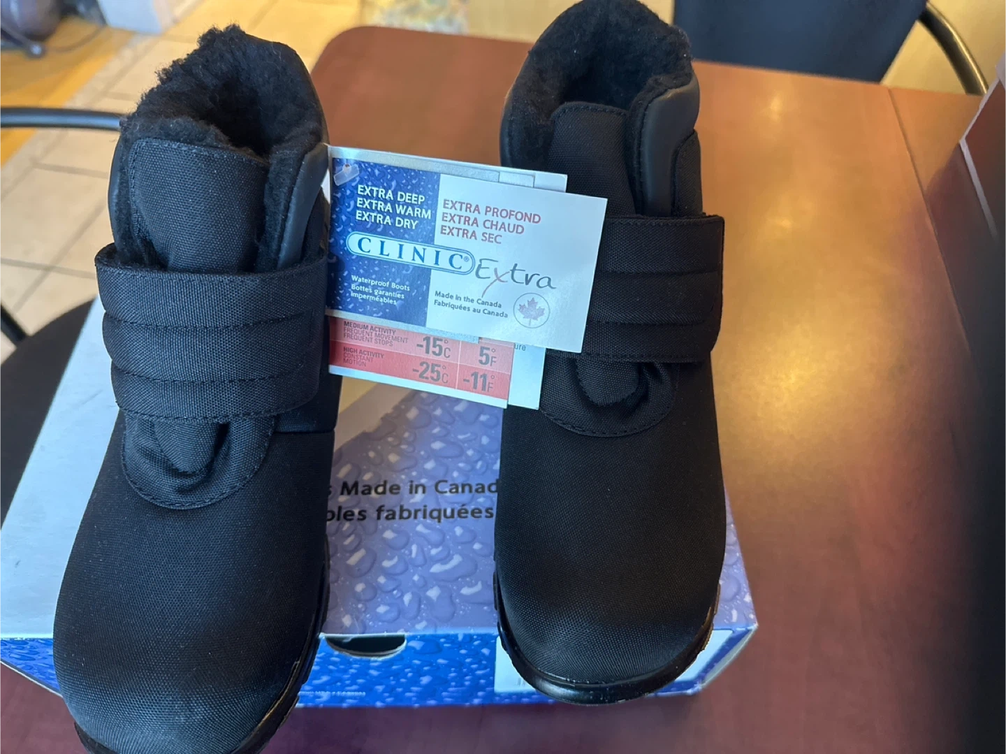 Keep your feet warm and dry with these Clinic Extra Olivia winter boots! They're designed for extra deep warmth and dryness, even in temperatures as low as -25°C/-11°F. - Brand: Clinic Extra - Model: Olivia - Size: 8.5W - Colour: Black These boots are made in Canada. The box is included!