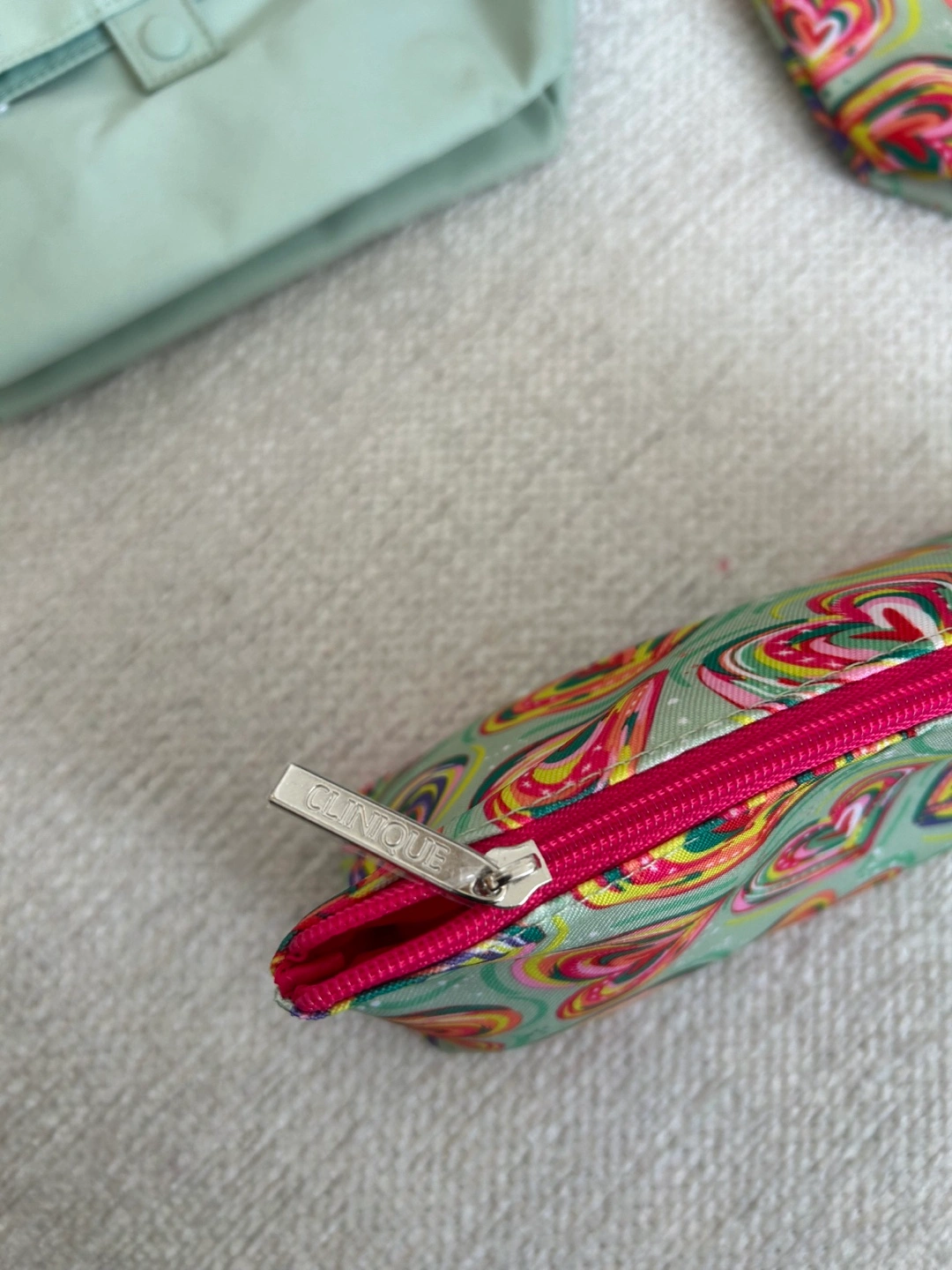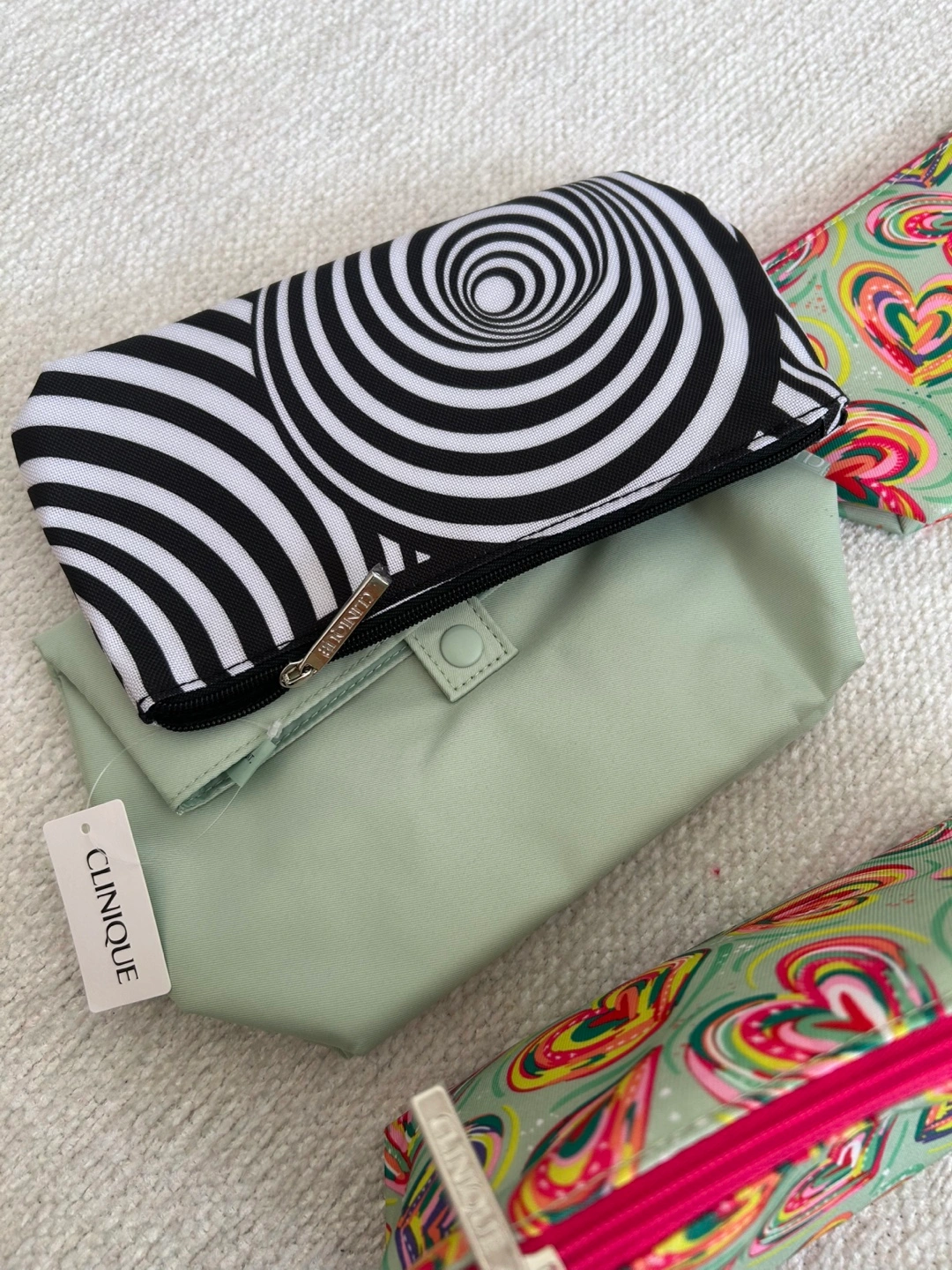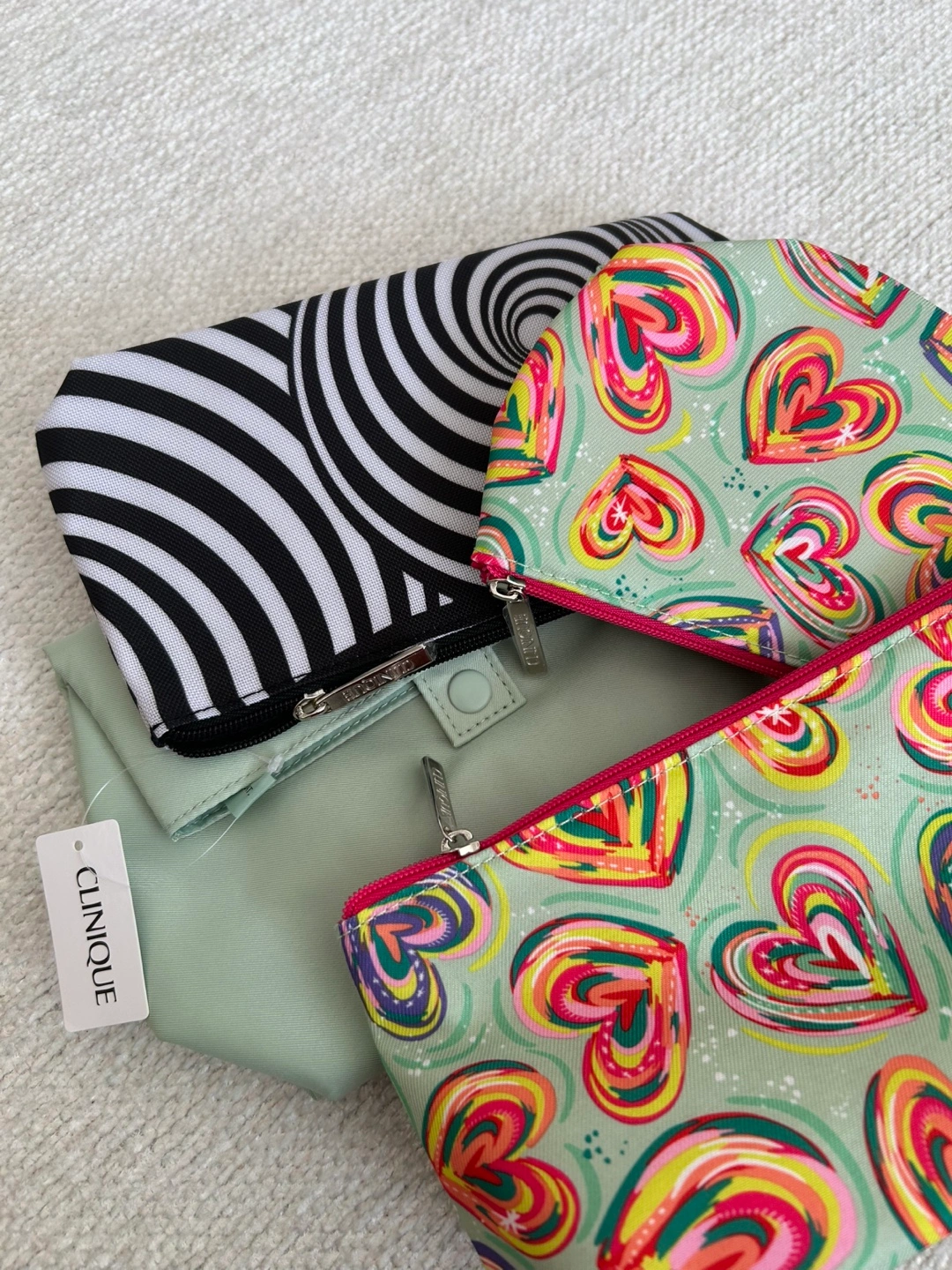 Selling a set of four Clinique makeup bags! They're in great condition and perfect for organizing your cosmetics or toiletries. The set includes a variety of designs, including a cool black and white swirl pattern and a fun heart print. A great addition to your travel essentials! Between 15-5 dollars each