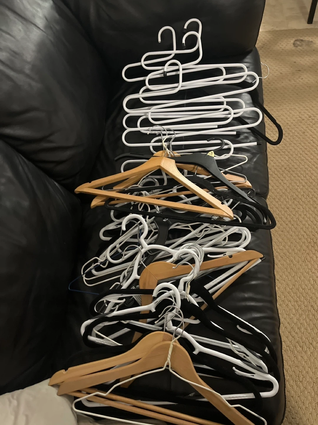 63Selling a collection of assorted clothes hangers. There's a mix of wooden, plastic, and velvet hangers in various colours. Great for organizing your closet!
