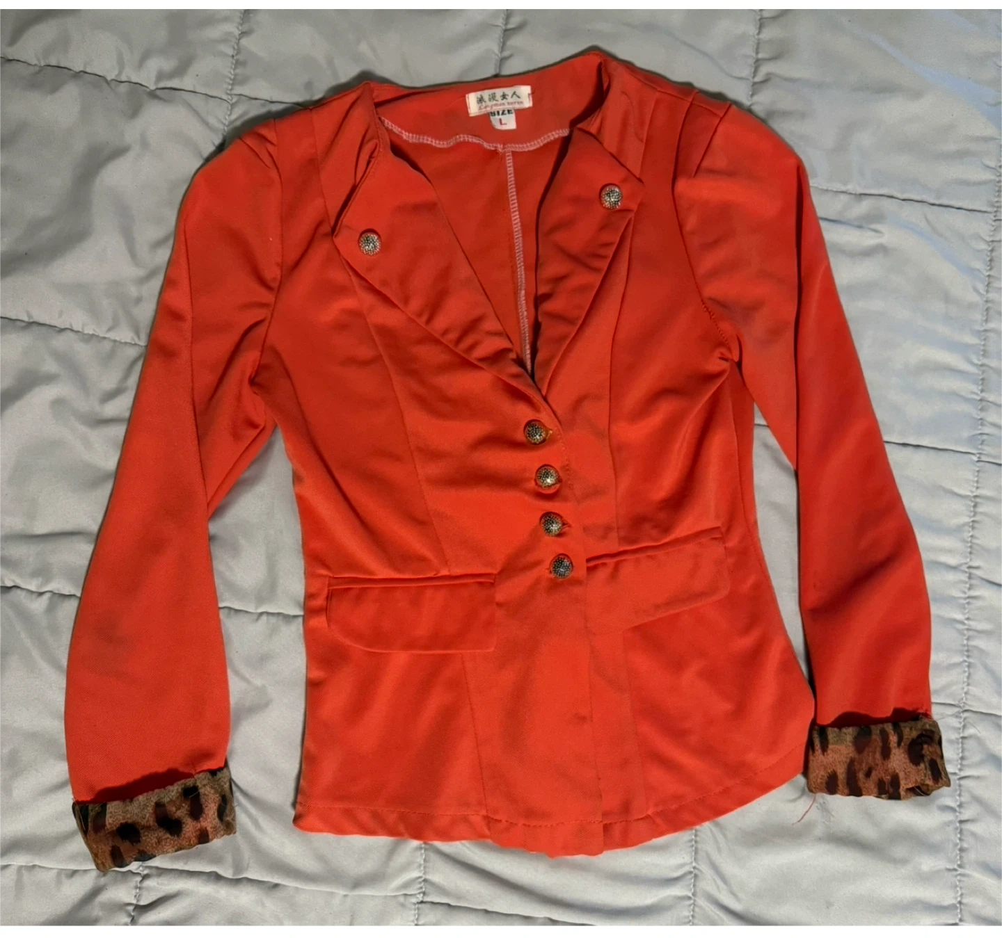15Description: Turn heads with this vibrant red-orange blazer, perfect for adding a bold touch to any outfit. • 👗 Size: Extra Small (XS) • ✨ Condition: Lightly worn, excellent shape—almost new • 🐆 Features chic leopard print cuffs and elegant decorative buttons • 🔥 Tailored fit with a flattering silhouette • 💵 Price: $30 CAD • 📦 Available now—message to grab it before it’s gone!