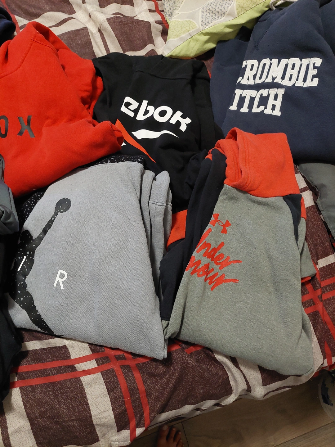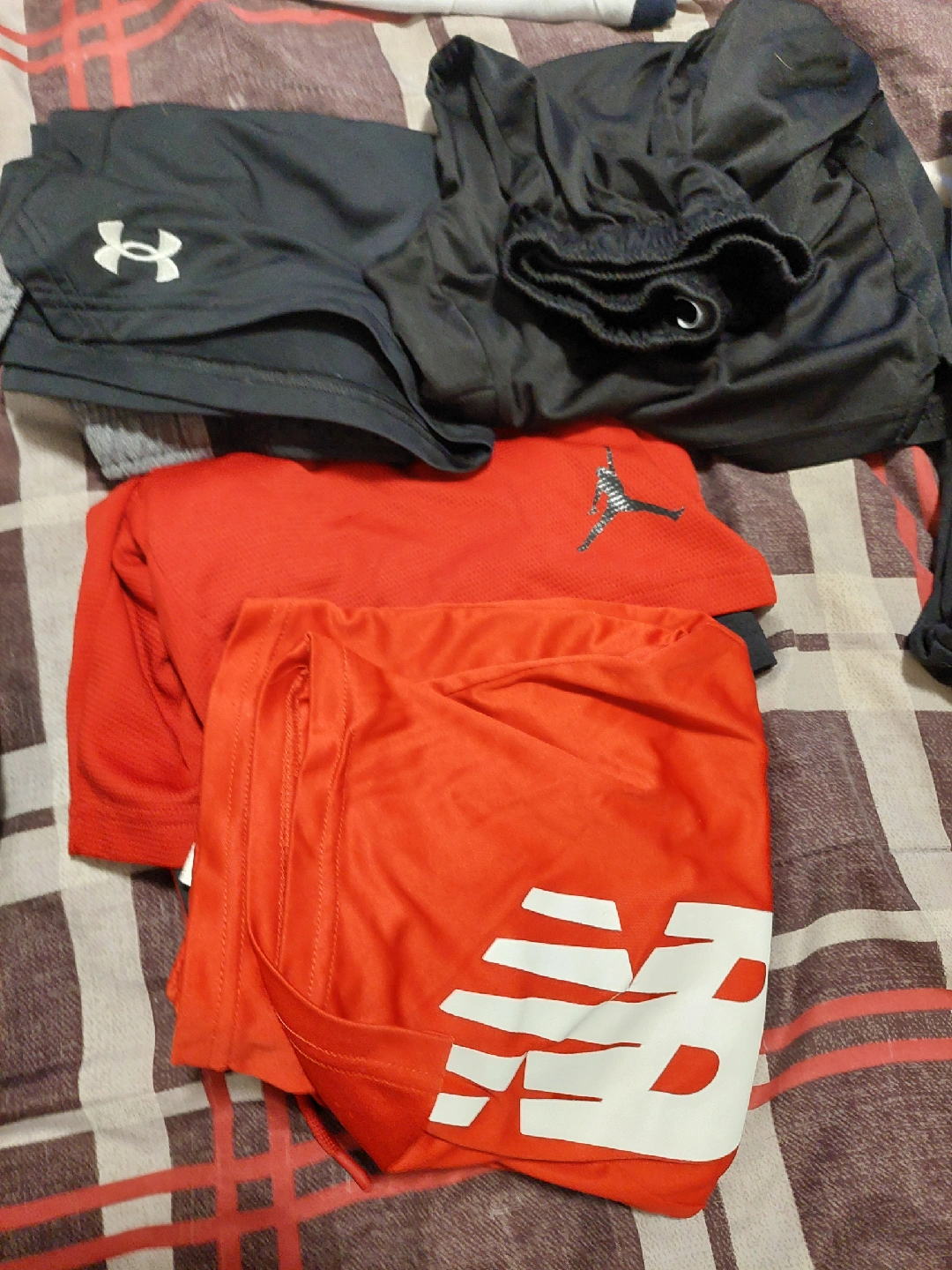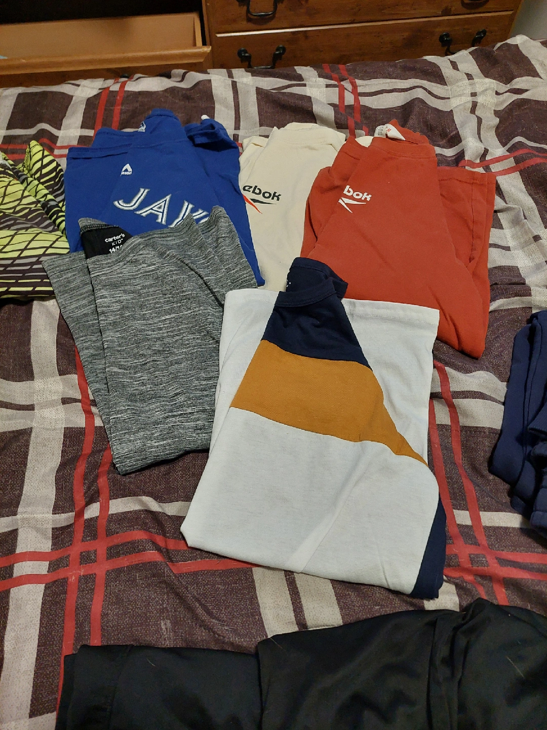 Selling a mixed lot of clothing items. Includes brands like Under Armour, Reebok, and New Balance. A variety of styles and colours are included in this lot size 12-14 also a box of clothes that may b under those sz for free but only if above is purchased