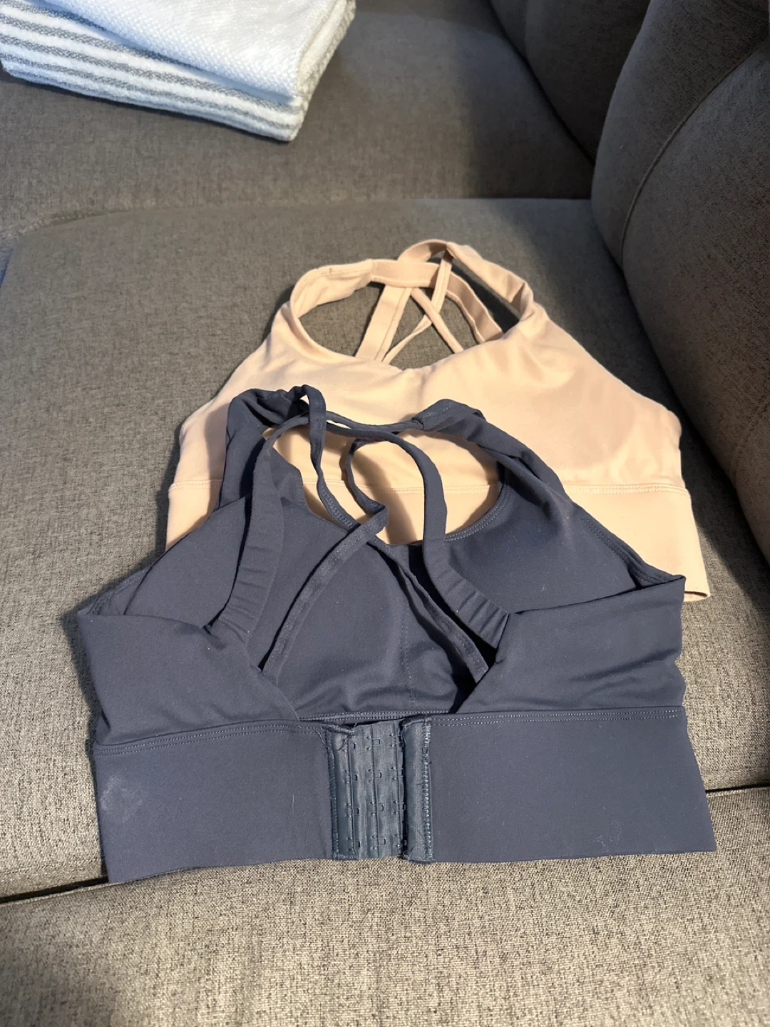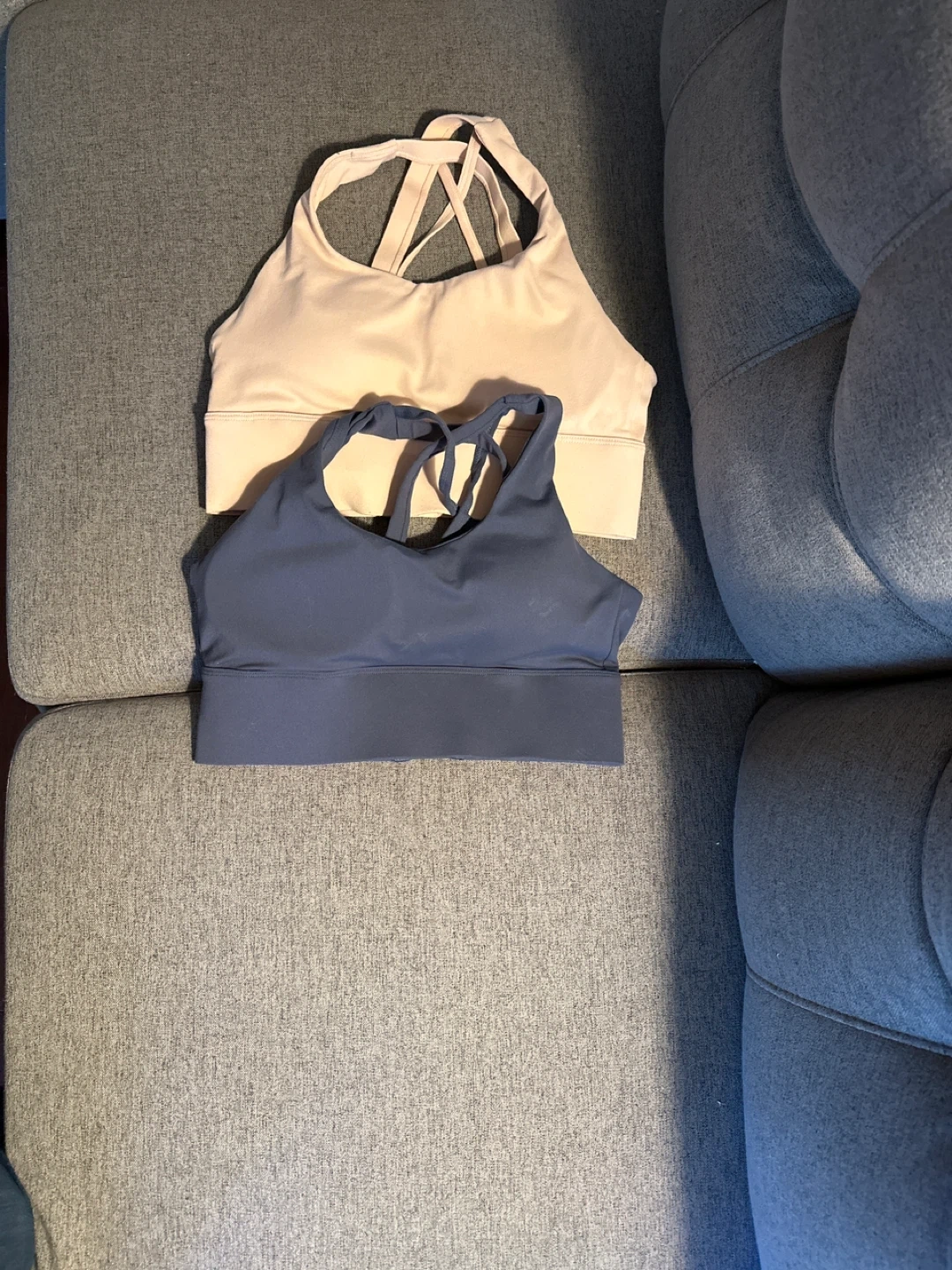 299Selling a bundle of two Lululemon Like a Cloud bras. One is a light beige colour and the other is a dark blue. Both are in great condition and size 6. Perfect for low-impact activities like yoga or lounging around!